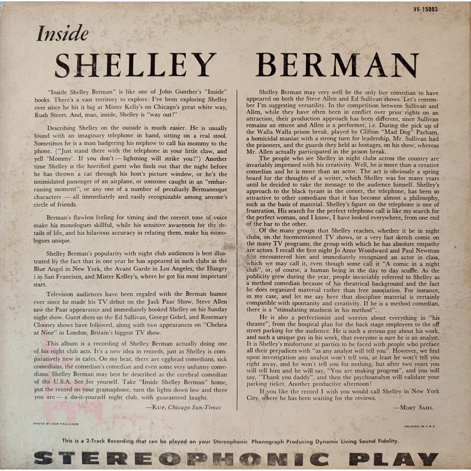 Prima edizione americana della fine degli anni '50 dell'album "Inside Shelley Berman" dell'attore e comico statunitense Shelley Berman.