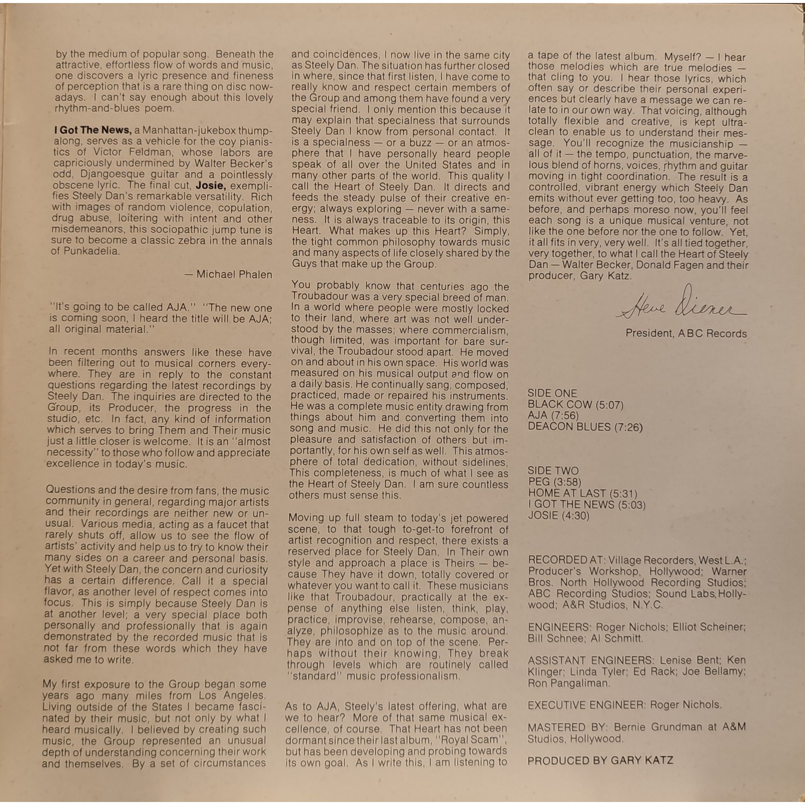 Datato 1977, etichetta ABC Records, gatefold comprensivo di inner sleeve originale con testi.