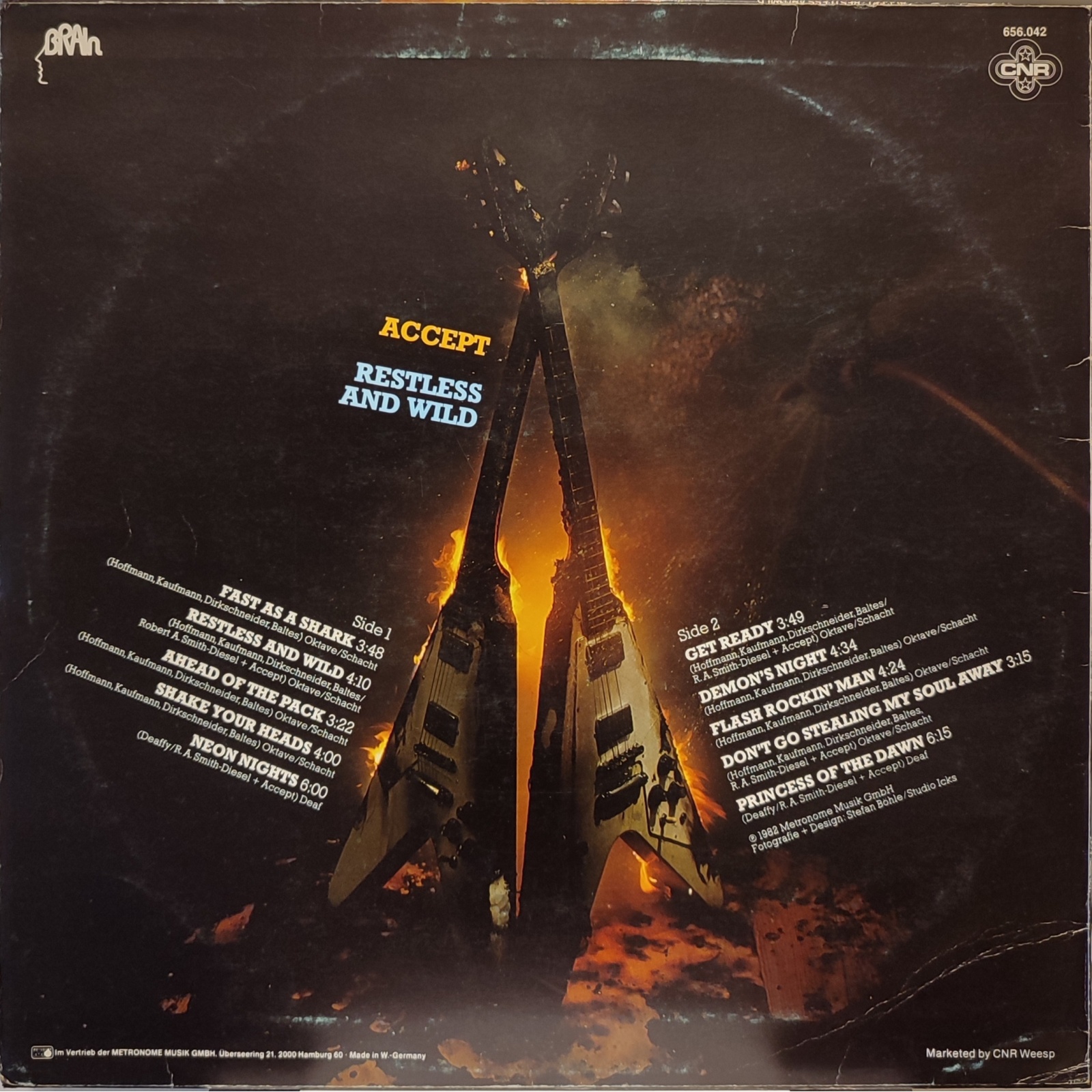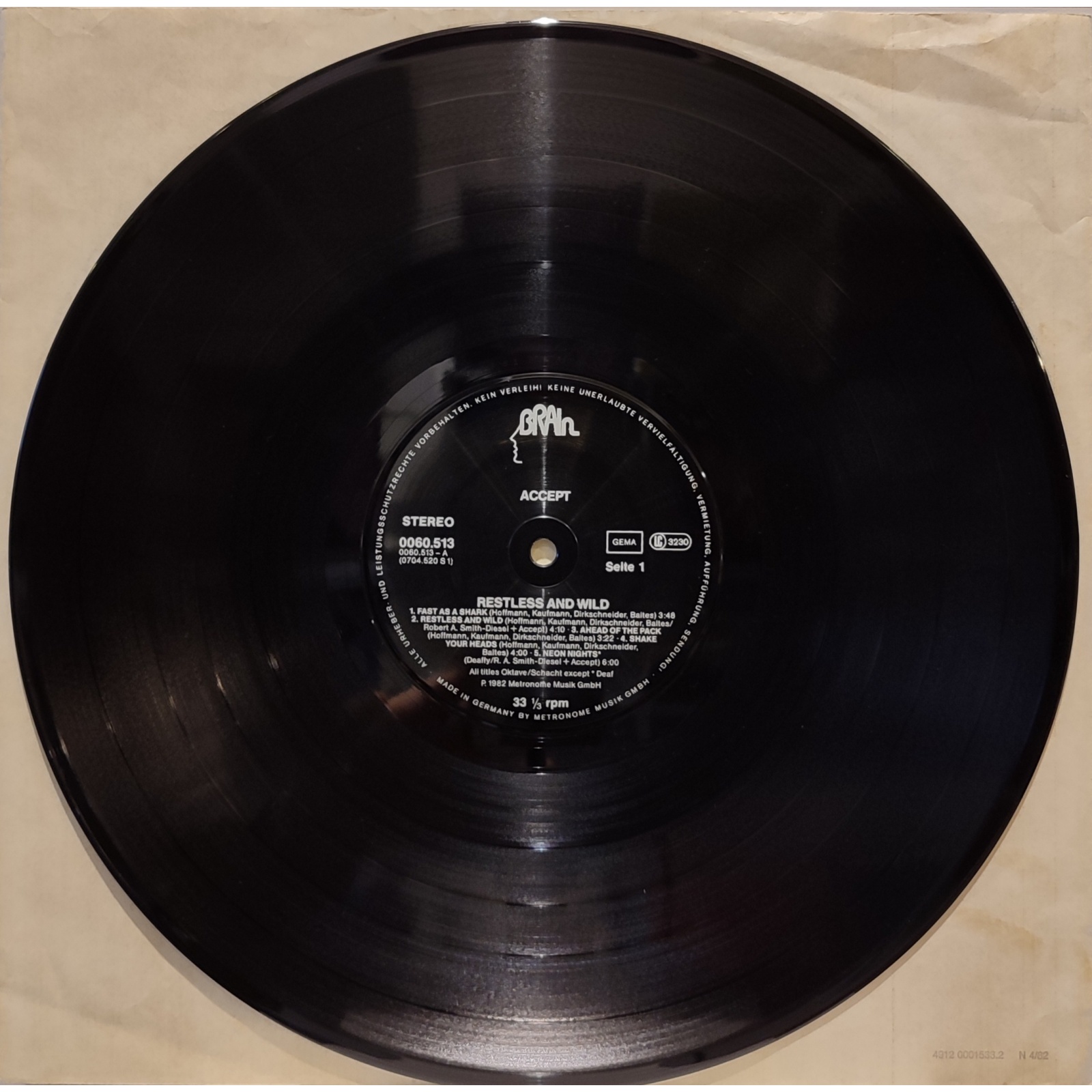 Prima edizione tedesca, in vinile di seconda mano, del quarto album in studio del gruppo heavy metal tedesco Accept,"Restless and wild".