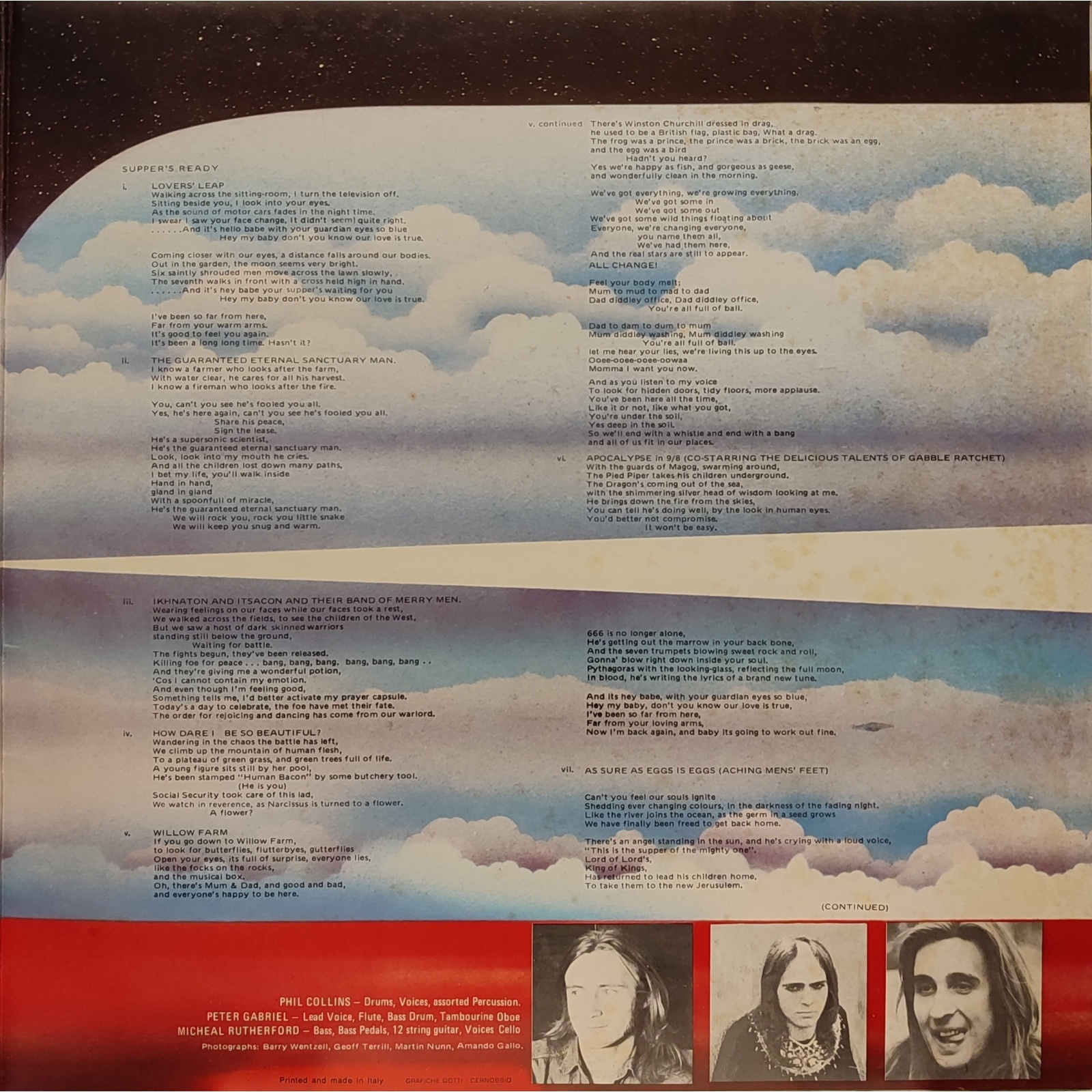 Se nel precedente "Nursery Cryme" i testi erano per gran parte ambientati nel passato, sia esso reale o letterario-fiabesco, in quest'album i riferimenti mitologici, letterari o biblici come in "Supper's Ready" o in "Can-Utility and the Coastliners" si affiancano all'attualità o al futuro fantascientifico ("Watcher of the Skies", "Get 'Em Out by Friday") o rimbalzano dagli uni agli altri (la stessa Supper's Ready).