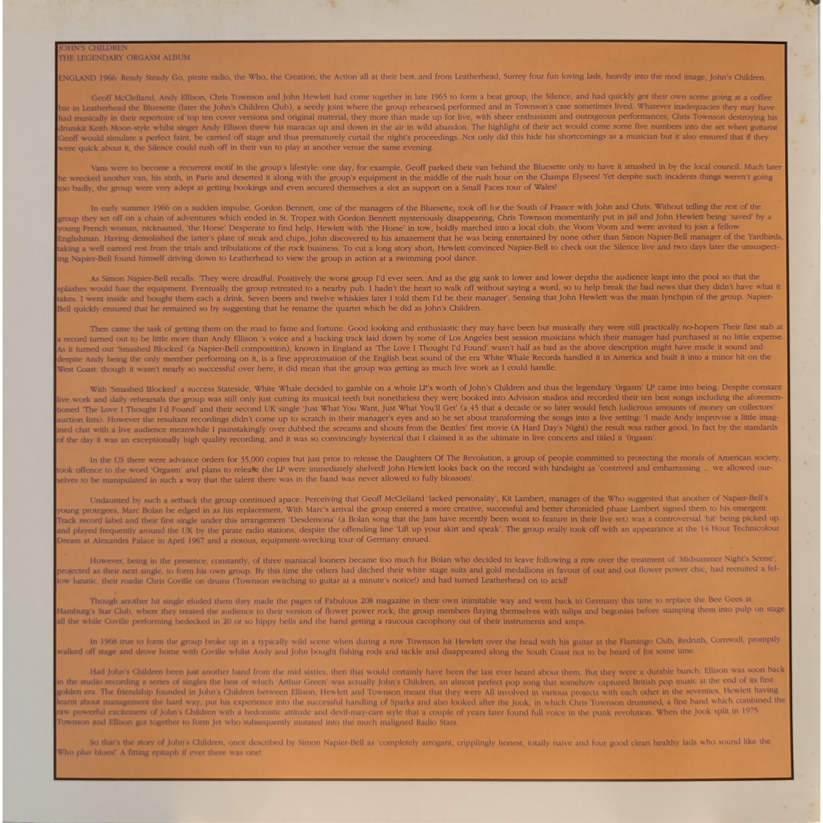Ristampa italiana, in vinile di seconda mano, dell'album "Orgasm" del gruppo rock inglese John's Children.