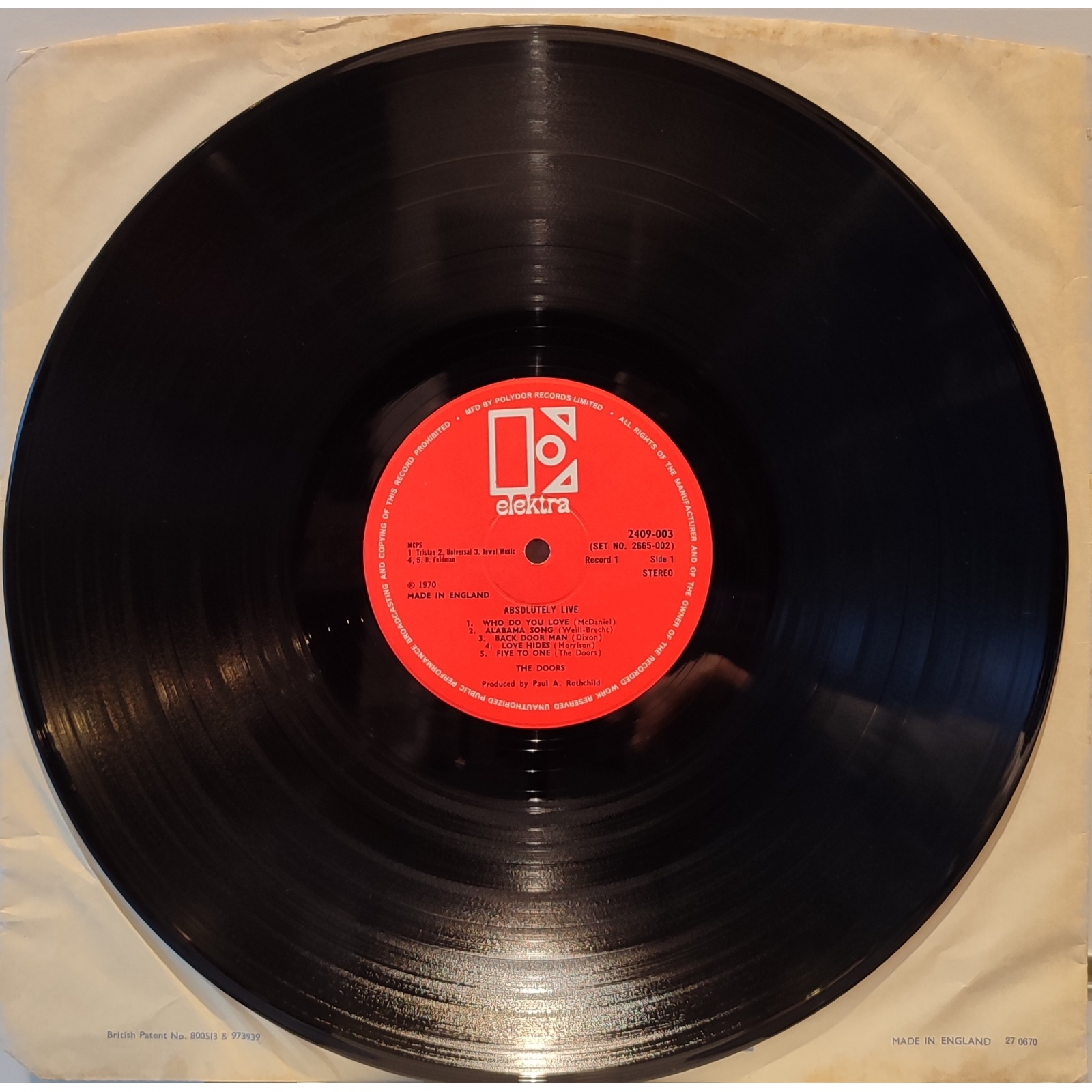 Rara prima edizione inglese, in vinile di seconda mano, del primo live del gruppo rock statunitense The Doors,"Absolutely live".