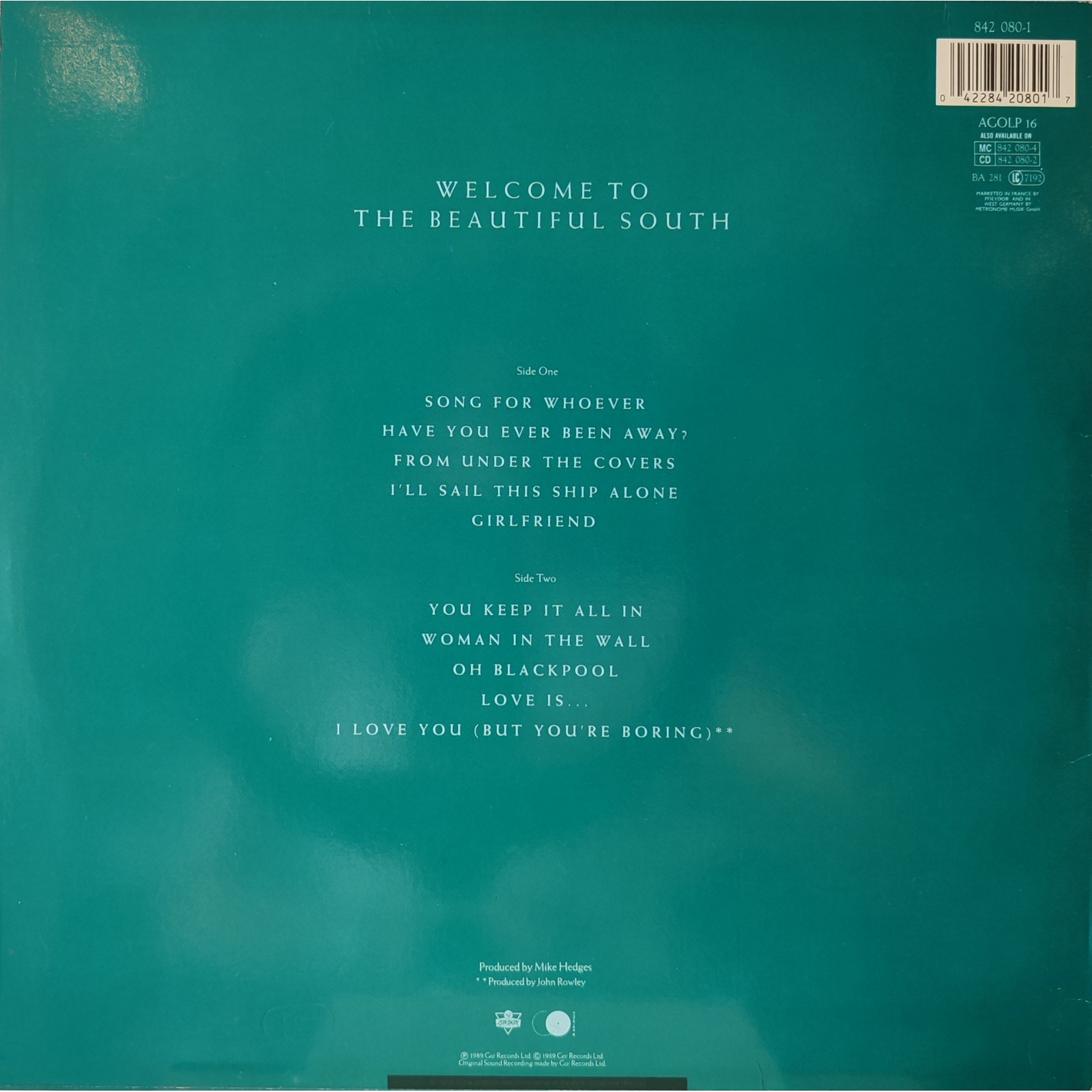 Prima edizione olandese in vinile di seconda mano del primo album in studio del gruppo pop inglese The Beautiful South, "Welcome to the beautiful south".