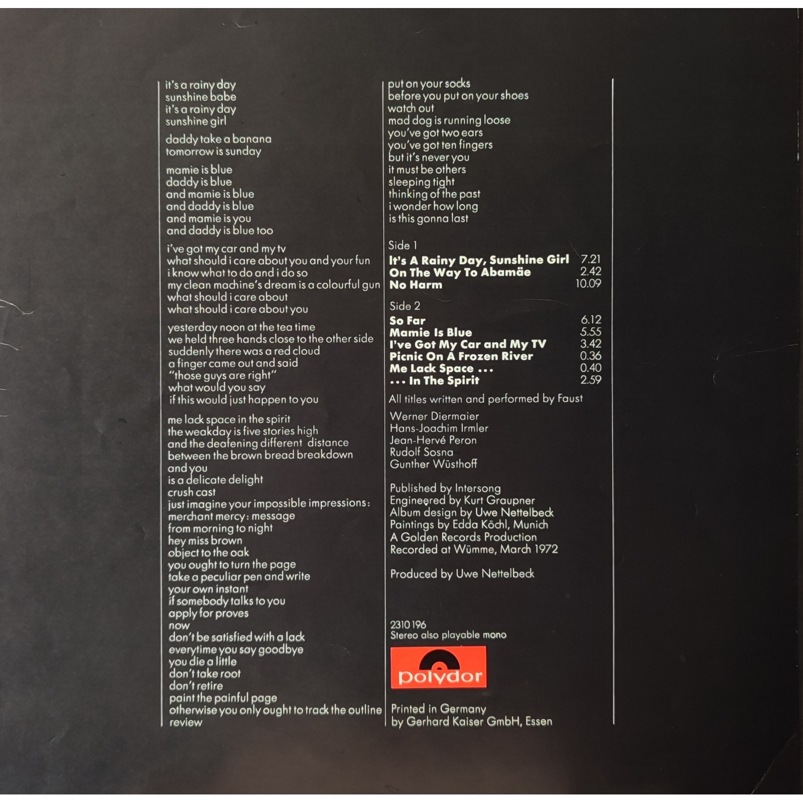 Datato 1972, etichetta Polydor, comprensivo di inner sleeve originale e inserto con tavole.