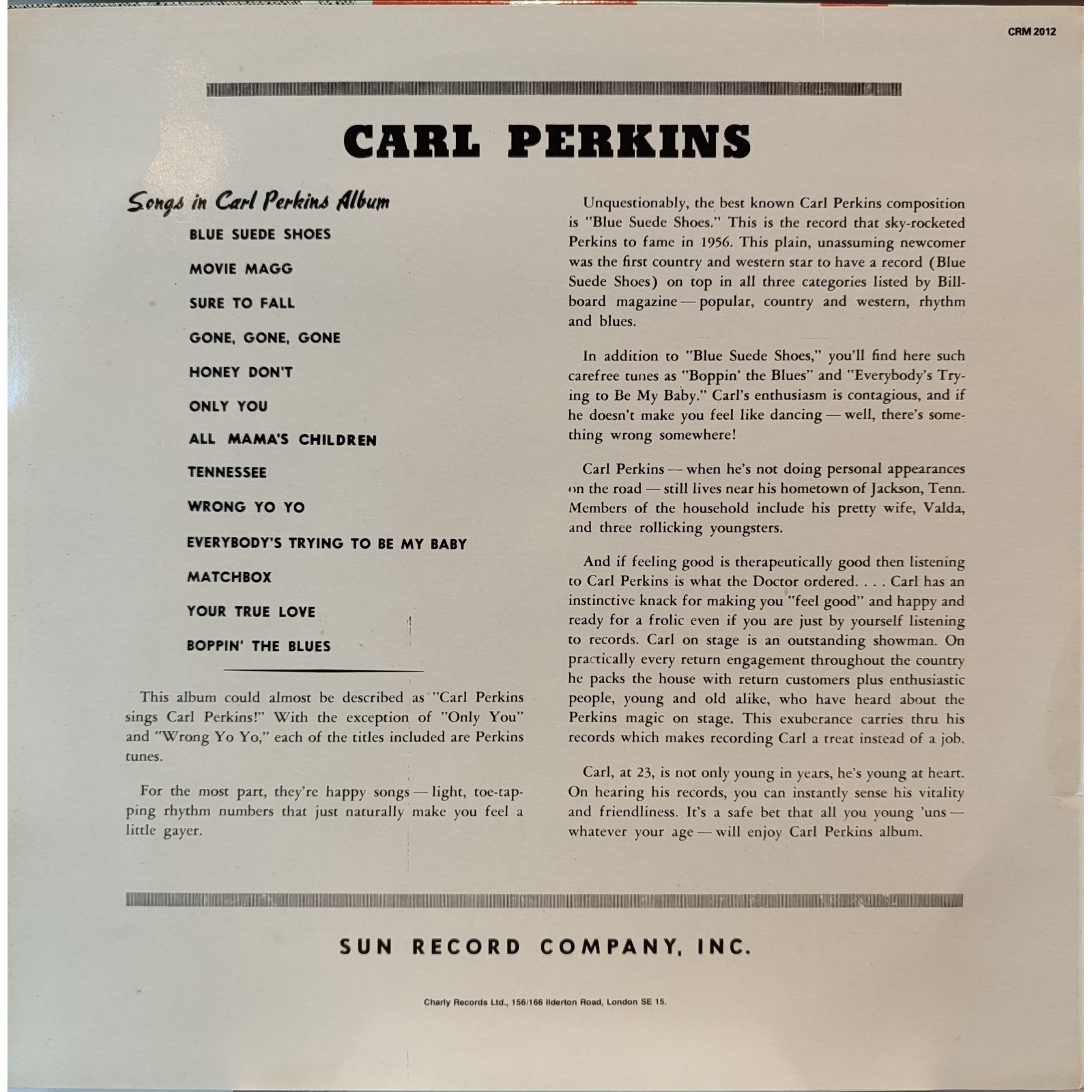 Pubblicato originariamente dalla Sun Records nel 1957, questa ristampa è datata 1985, etichetta Charly.