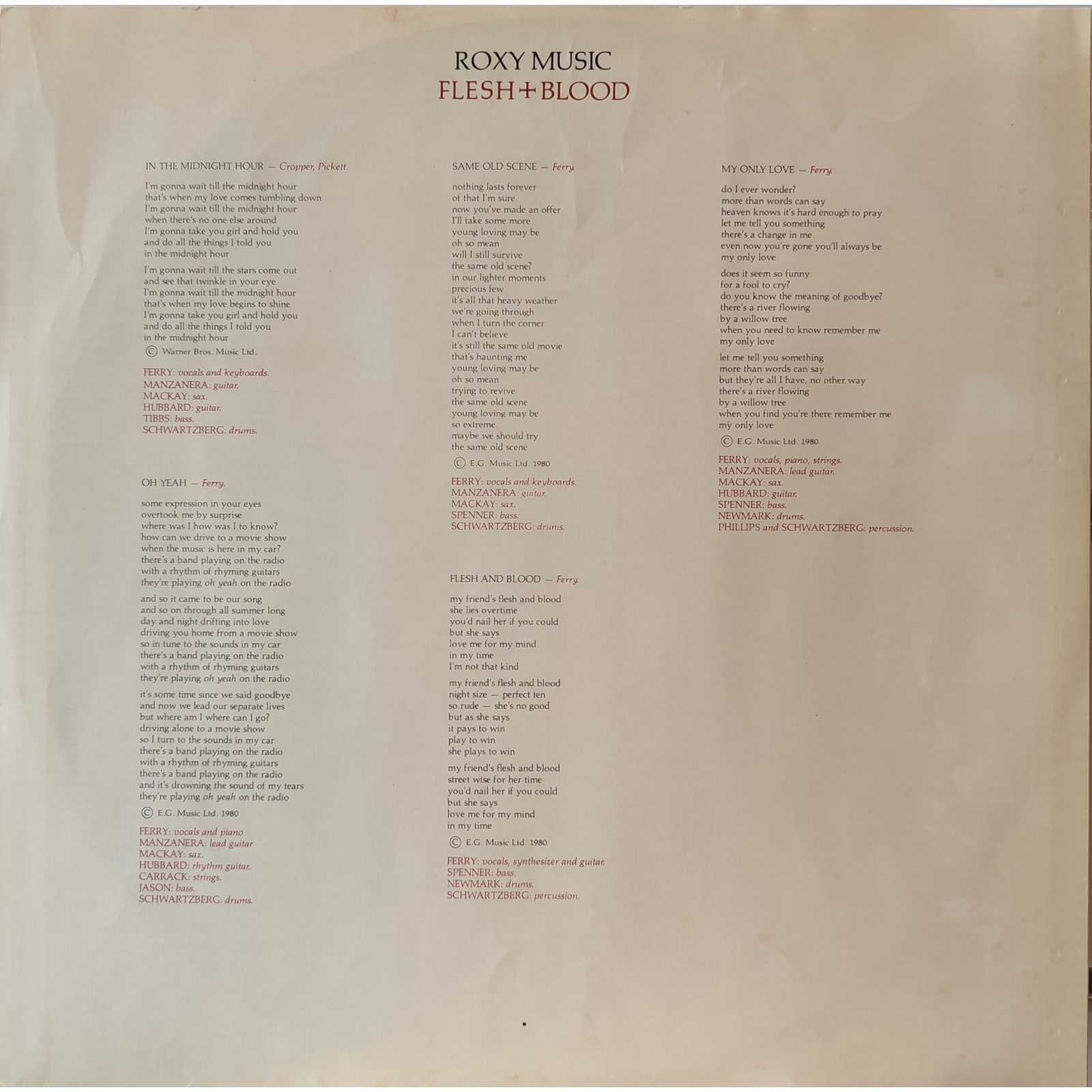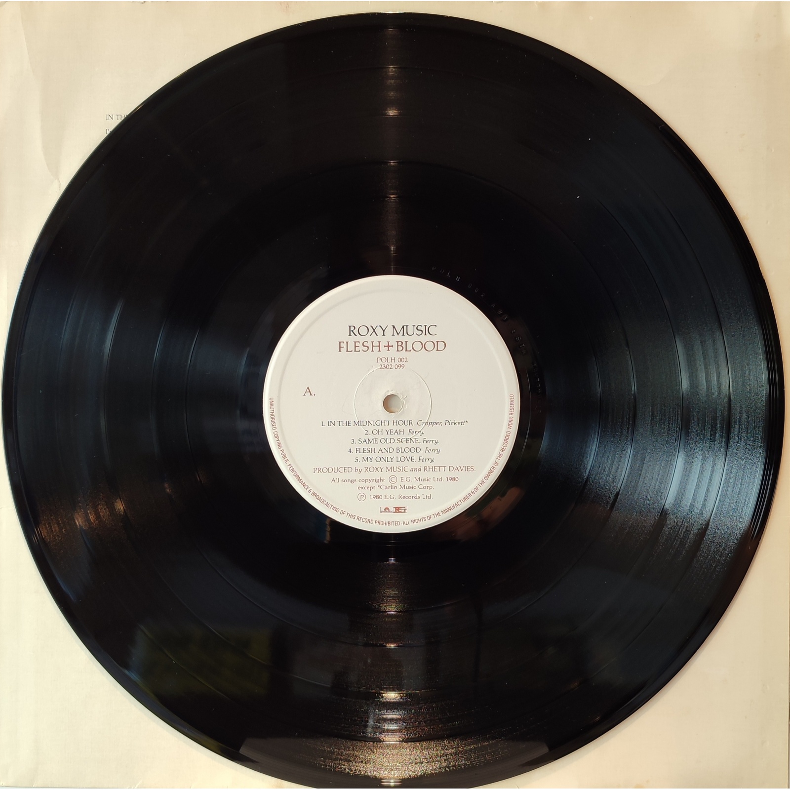 Prima edizione inglese, in vinile di seconda mano, del settimo album in studio del gruppo glam rock inglese Roxy Music,"Flesh + Blood".