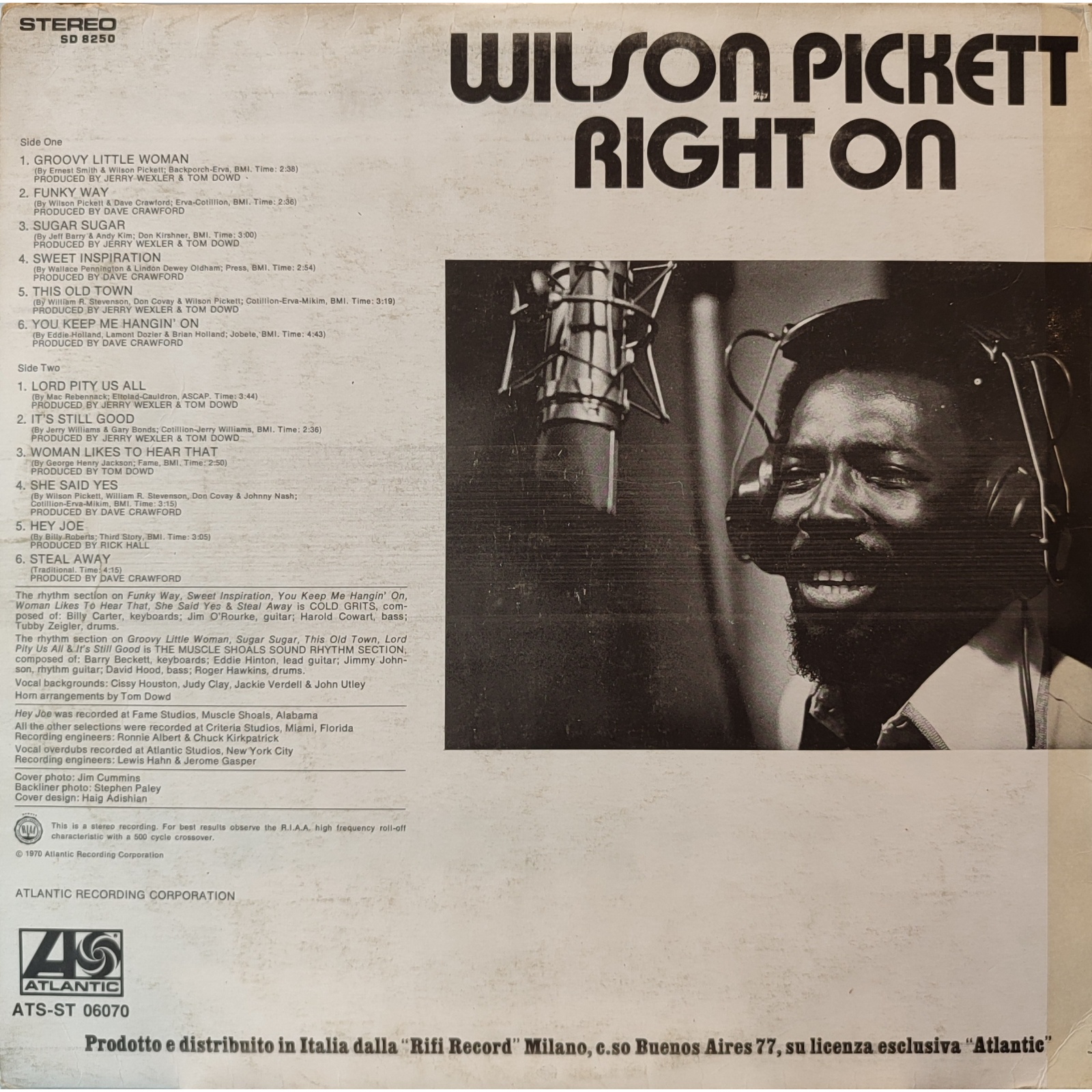 Prima edizione italiana, in vinile di seconda mano, dell'album "Right on" del cantautore statunitense rhythm and blues Wilson Pickett.