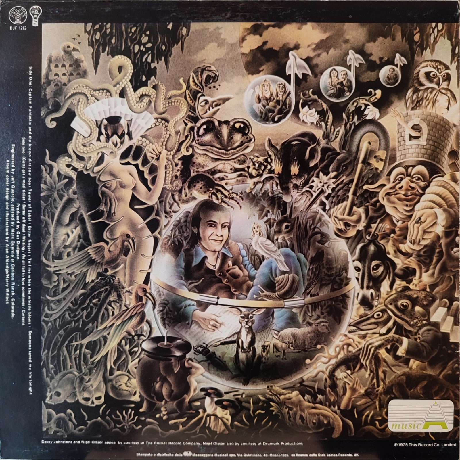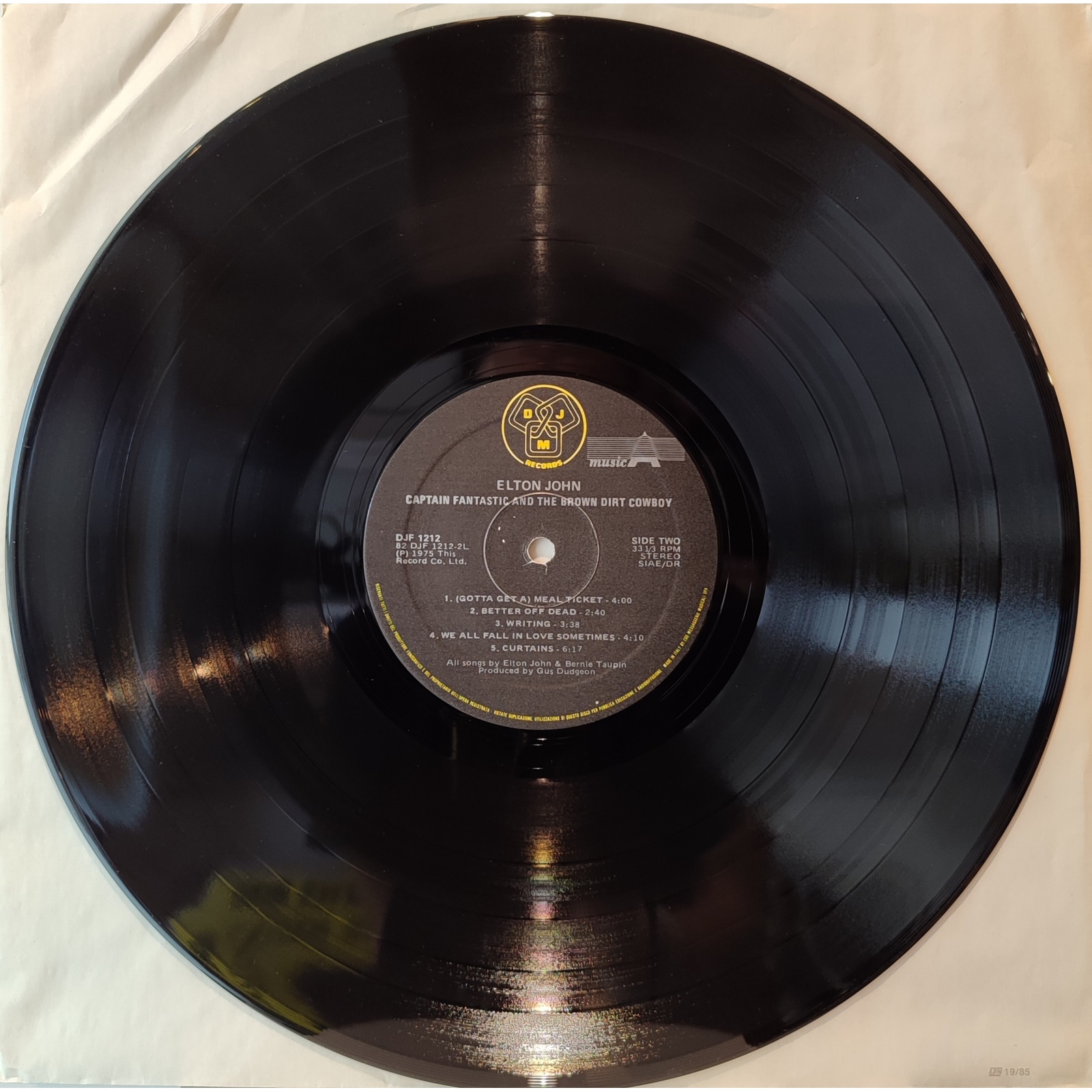 Ristampa italiana, in vinile di seconda mano, del dodicesimo album in studio del cantante, compositore e pianista britannico Elton John, "Captain Fantastic and the Brown Dirt Cowboy".