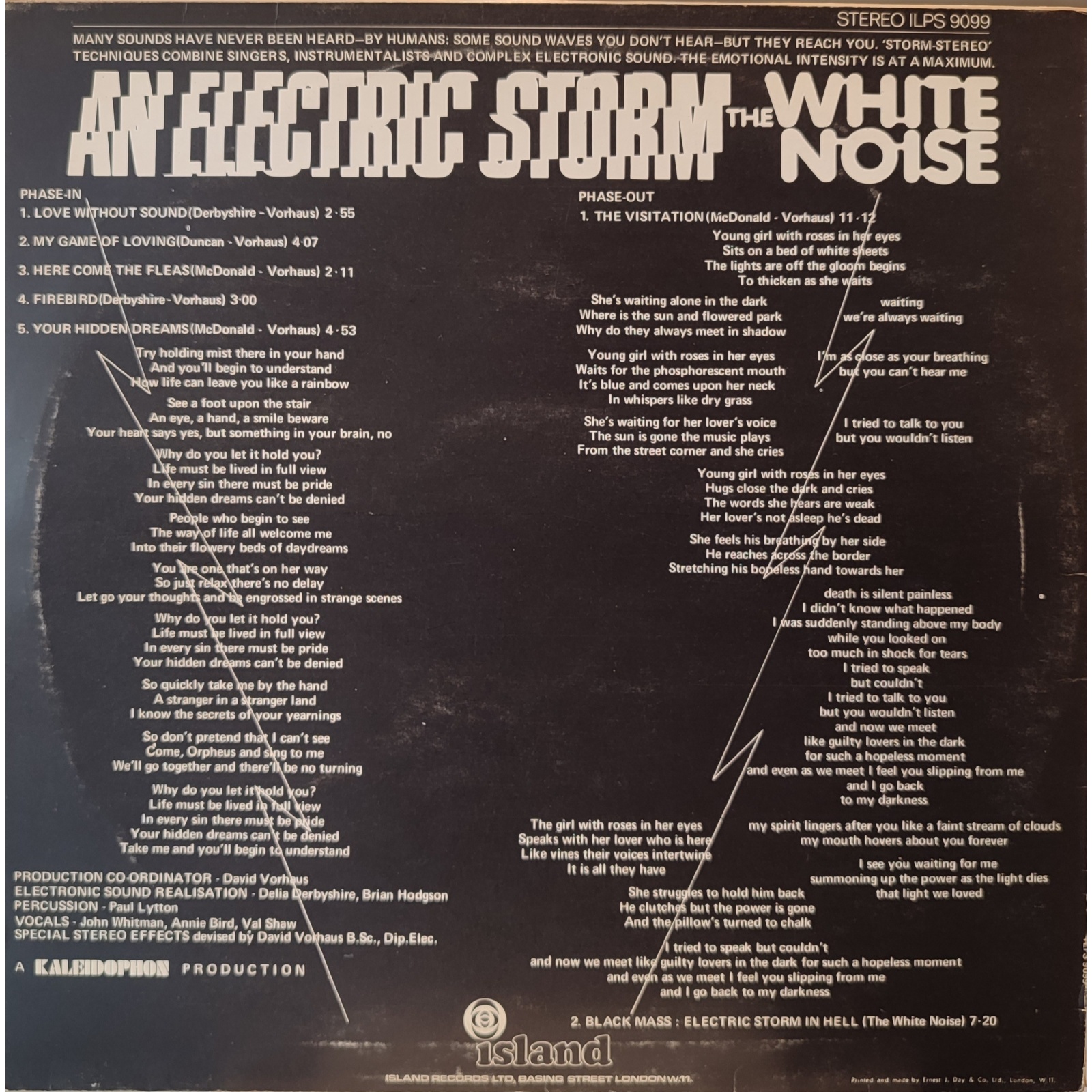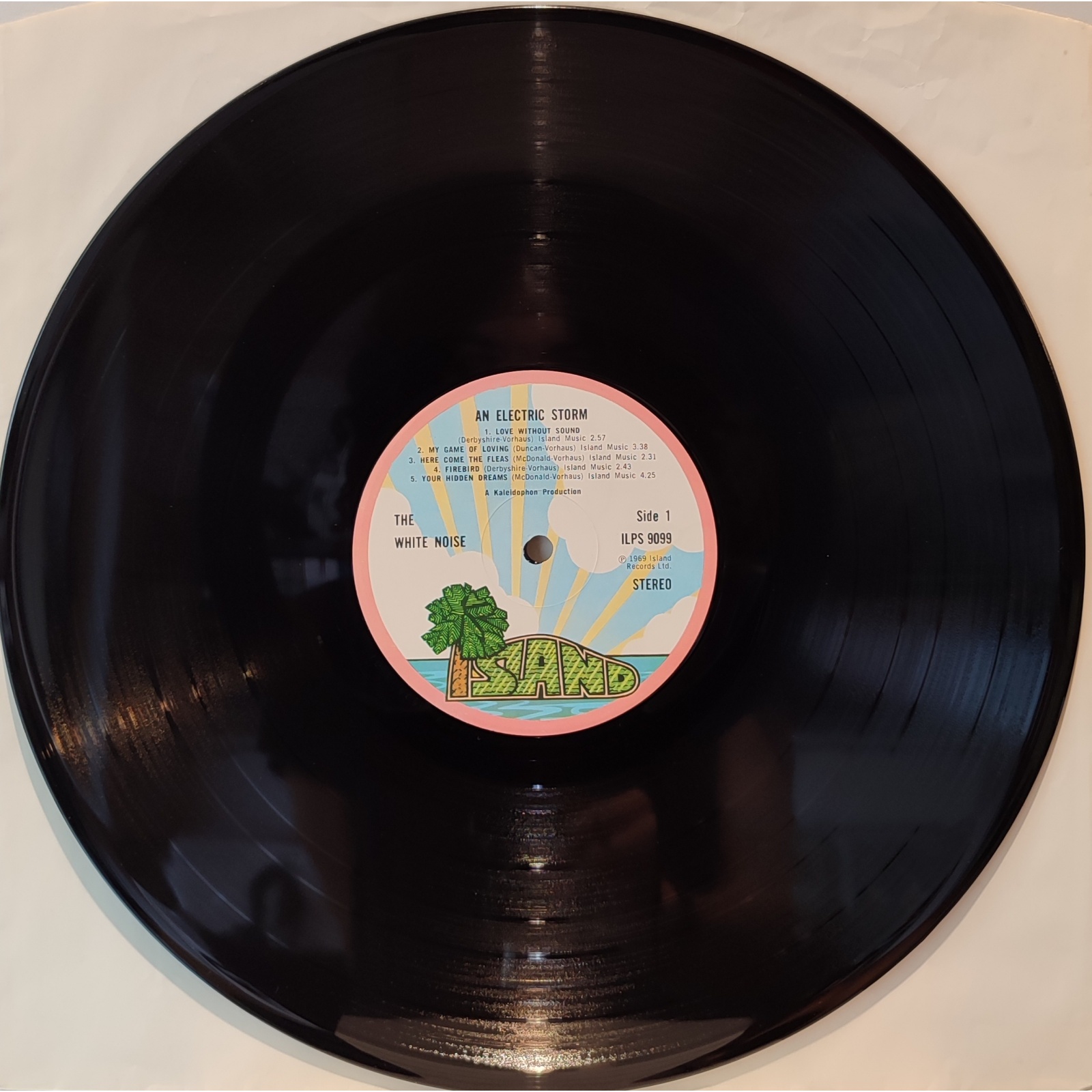 Ristampa inglese, in vinile di seconda mano, dell'album di debutto della band inglese di musica elettronica sperimentale White Noise,"An Electric Storm".