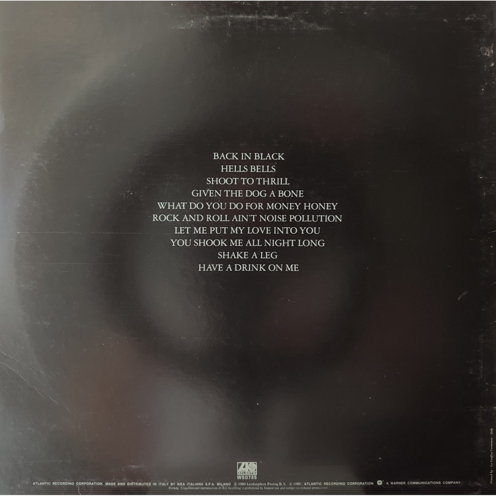 Ristampa italiana, in vinile di seconda mano, del settimo album in studio del gruppo hard rock australiano AC/DC, "Back in black".