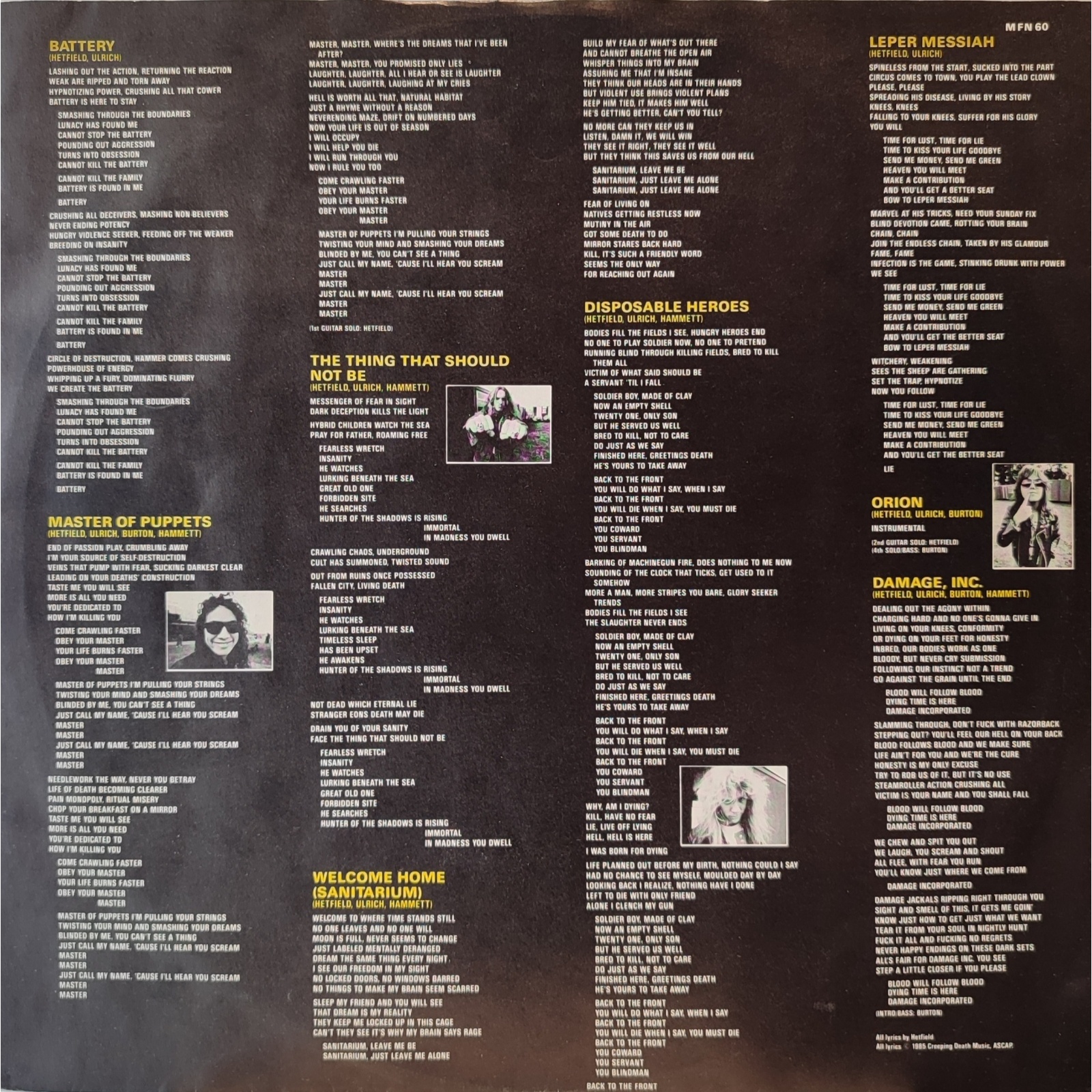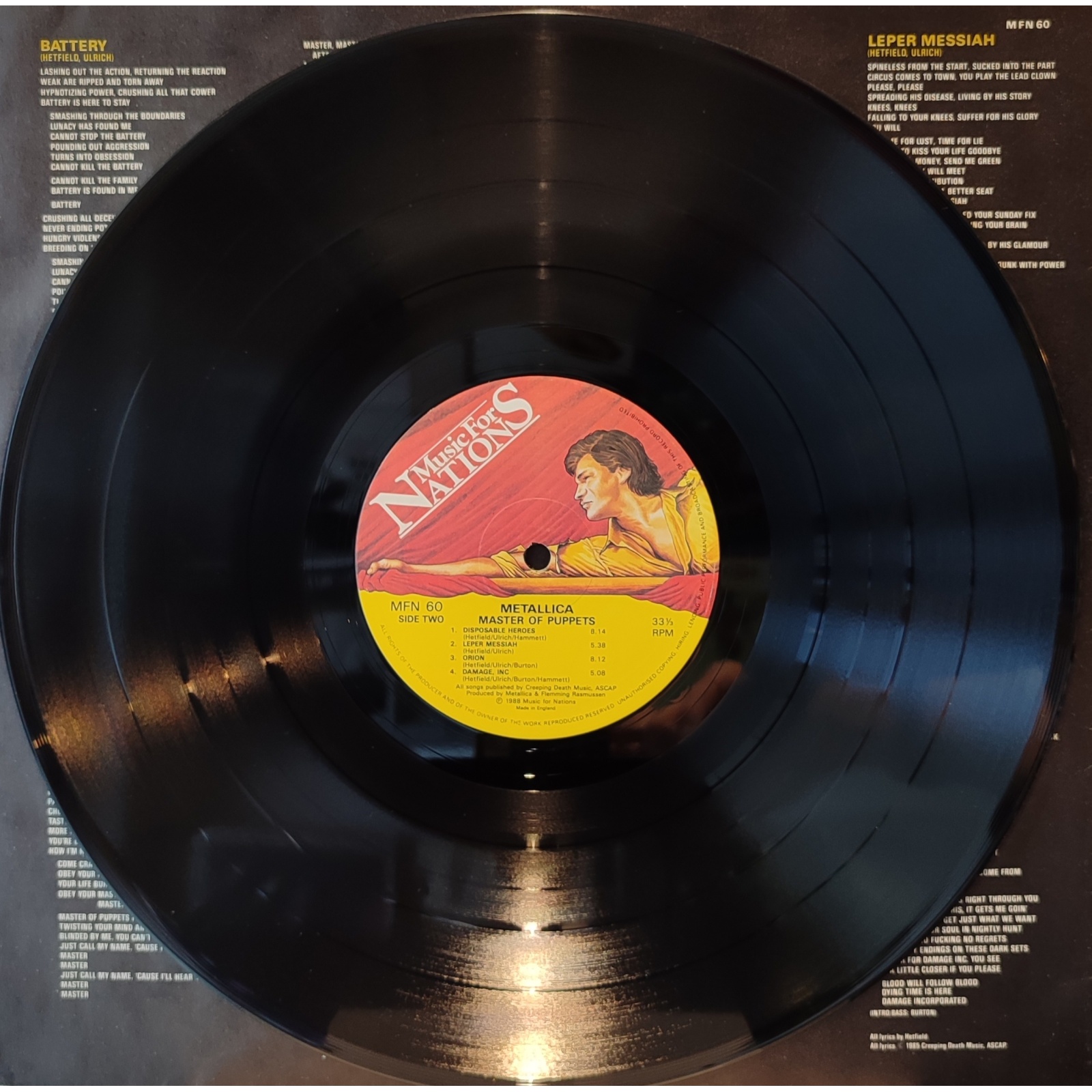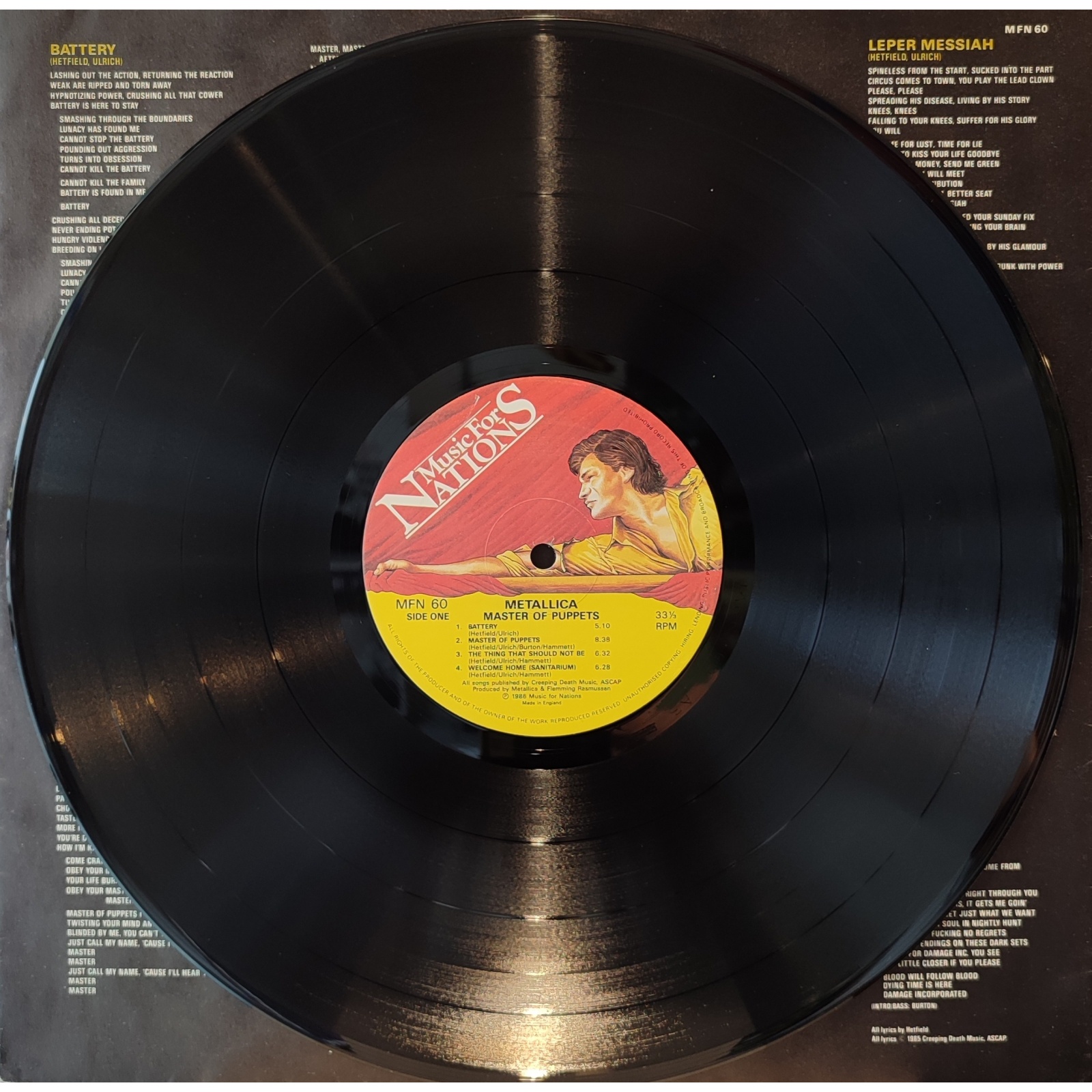 Ristampa inglese, in vinile di seconda mano, del terzo album in studio del gruppo heavy metal statunitense Metallica,"Master of Puppets".