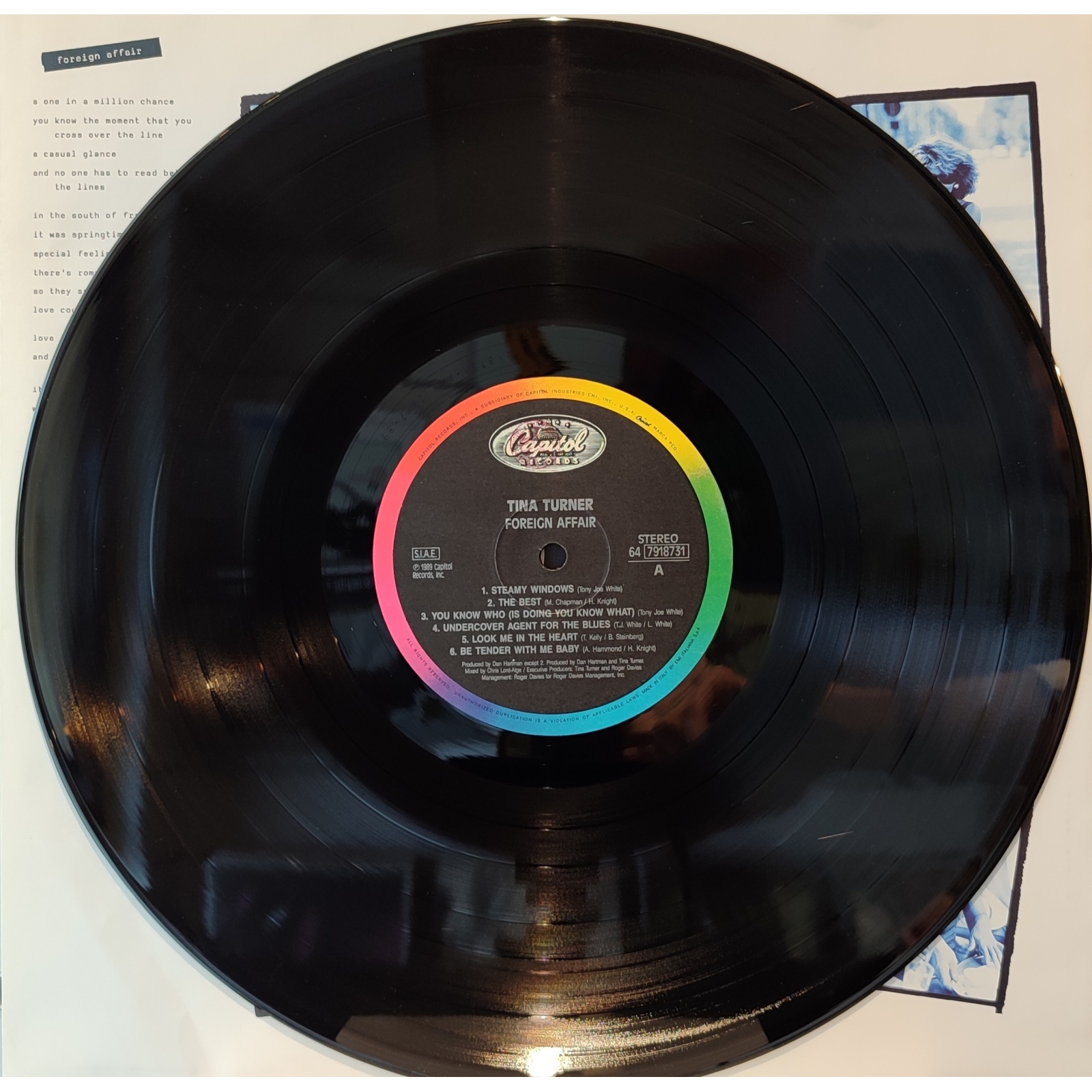 Prima edizione italiana, in vinile di seconda mano, del settimo album in studio della cantante statunitense pop rock Tina Turner,"Foreign affair".