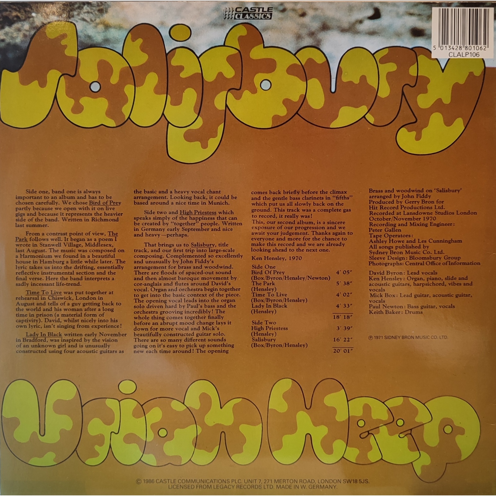 Ristampa inglese/tedesca, in vinile di seconda mano, del secondo album in studio del gruppo hard rock progressive inglese Uriah Heep,"Salisbury".