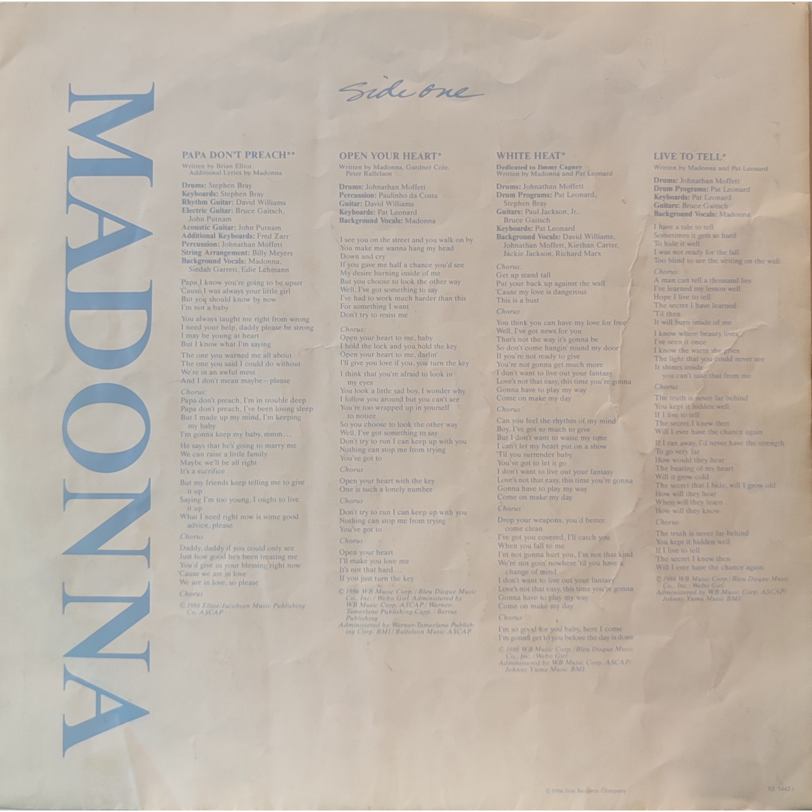 Disco dedicato all'allora marito, l'attore Sean Penn, contiene i singoli "La Isla Bonita", "Papa don't preach", "Open your heart".