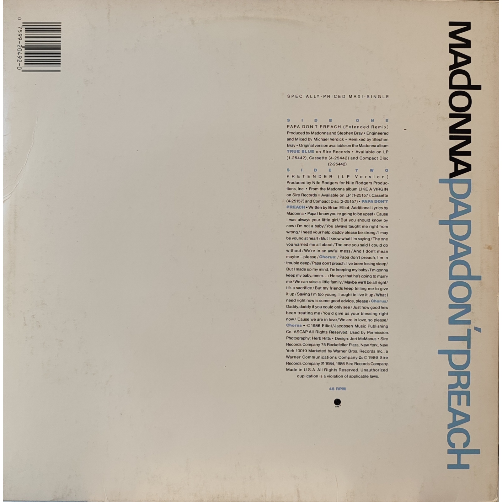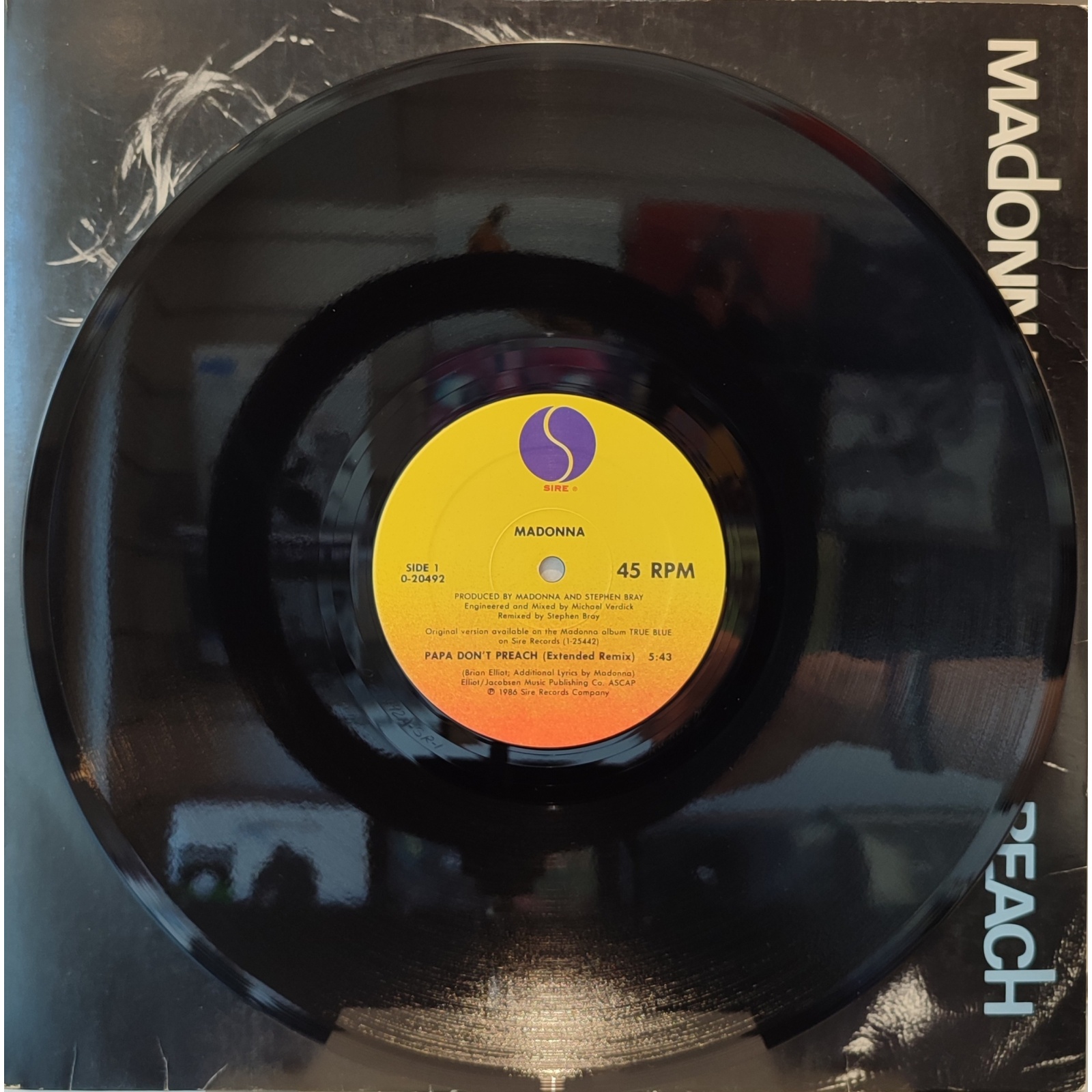 Prima edizione americana, in vinile di seconda mano, del maxi singolo 45 giri "Papa don't preach" della cantante pop statunitense Madonna.