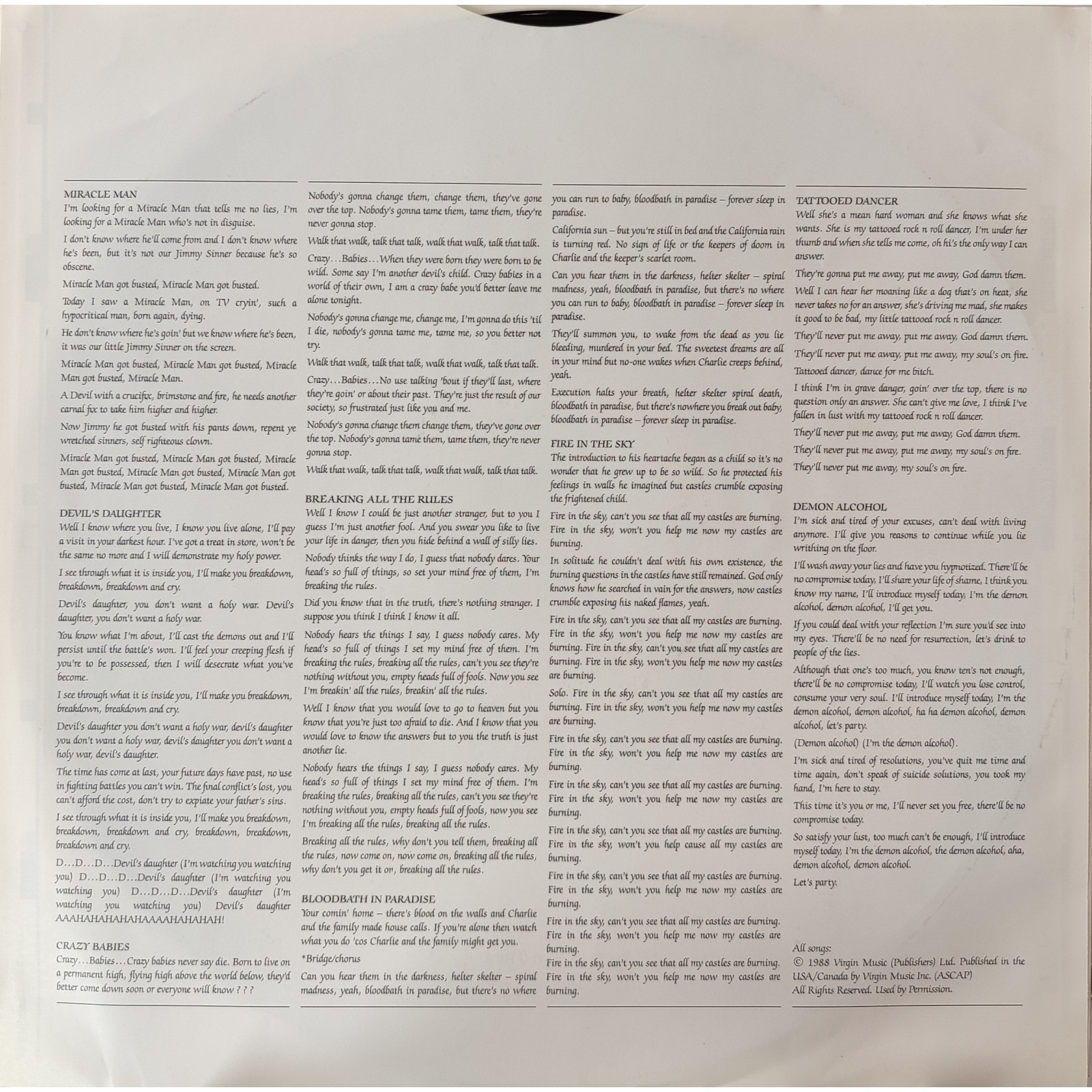 Datato 1988, etichetta Epic, comprensivo di inner sleeve originale con testi e foto.