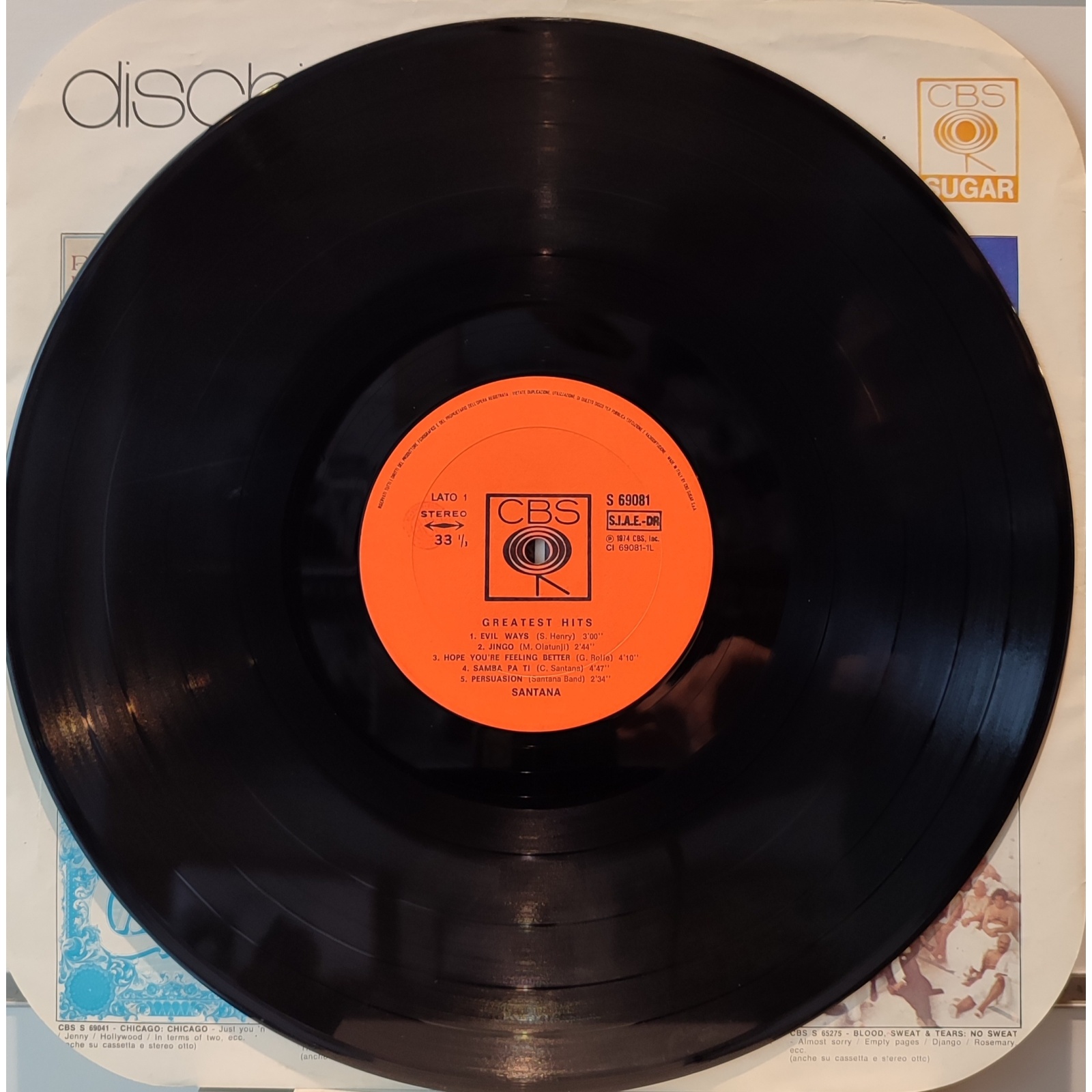 Prima edizione italiana, in vinile di seconda mano, della prima raccolta di successi del chitarrista e compositore rock latino Santana,"Santana's greatest hits".