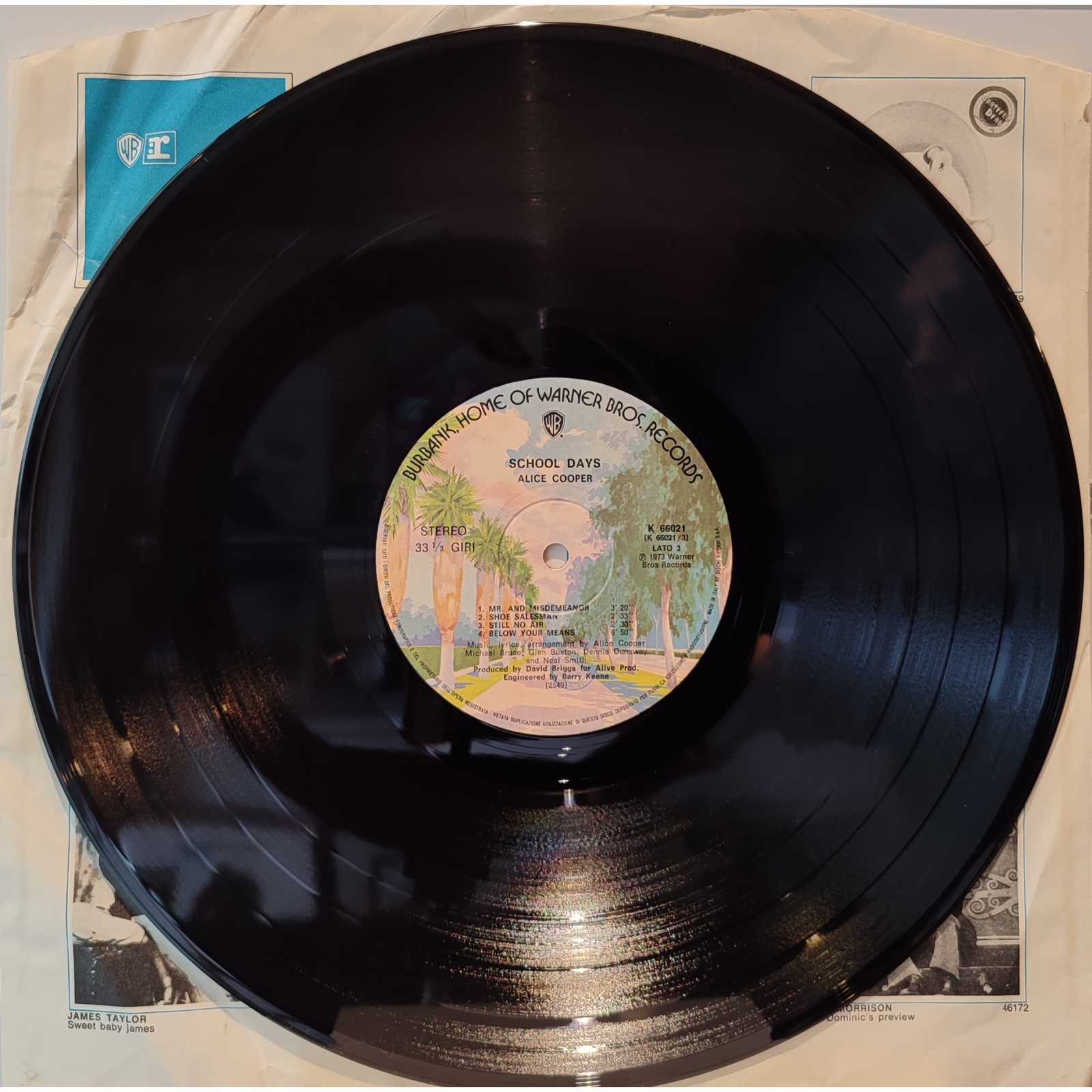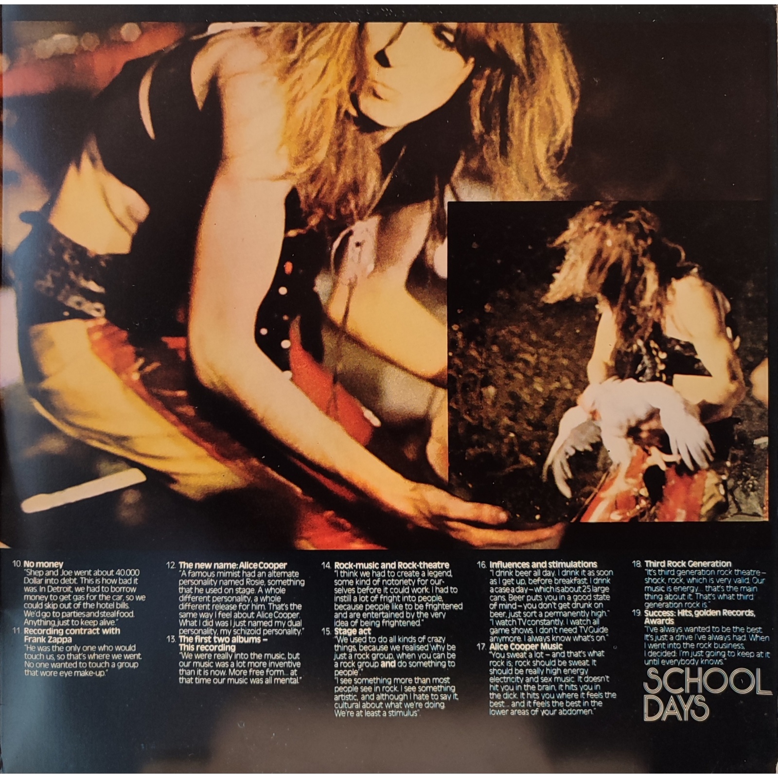 Prima edizione italiana, in vinile di seconda mano, del doppio LP che contiene i primi due album del cantante hard rock statunitense Alice Cooper,"School Days: the early recordings".