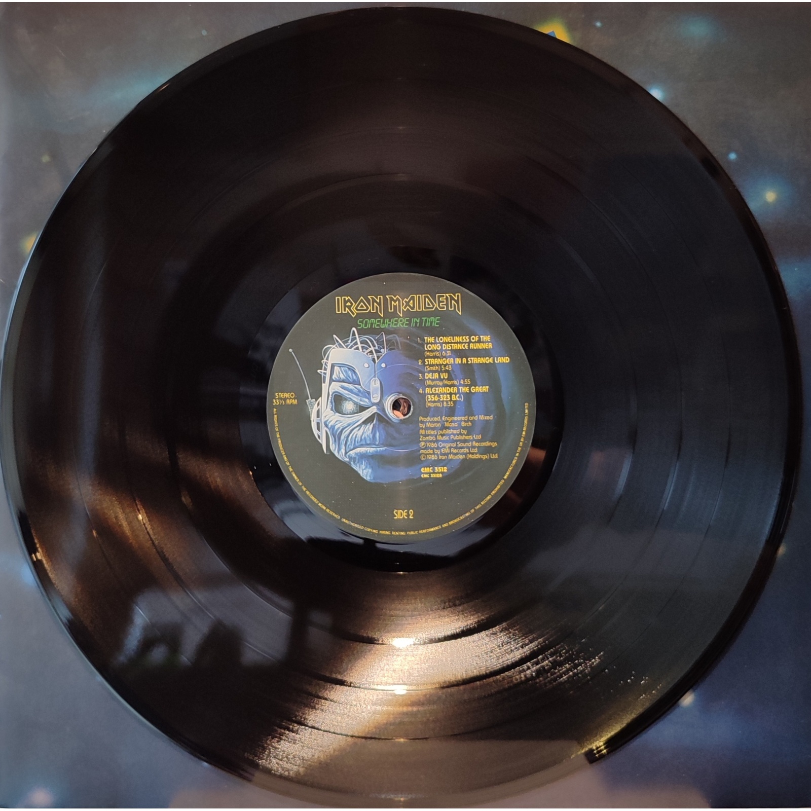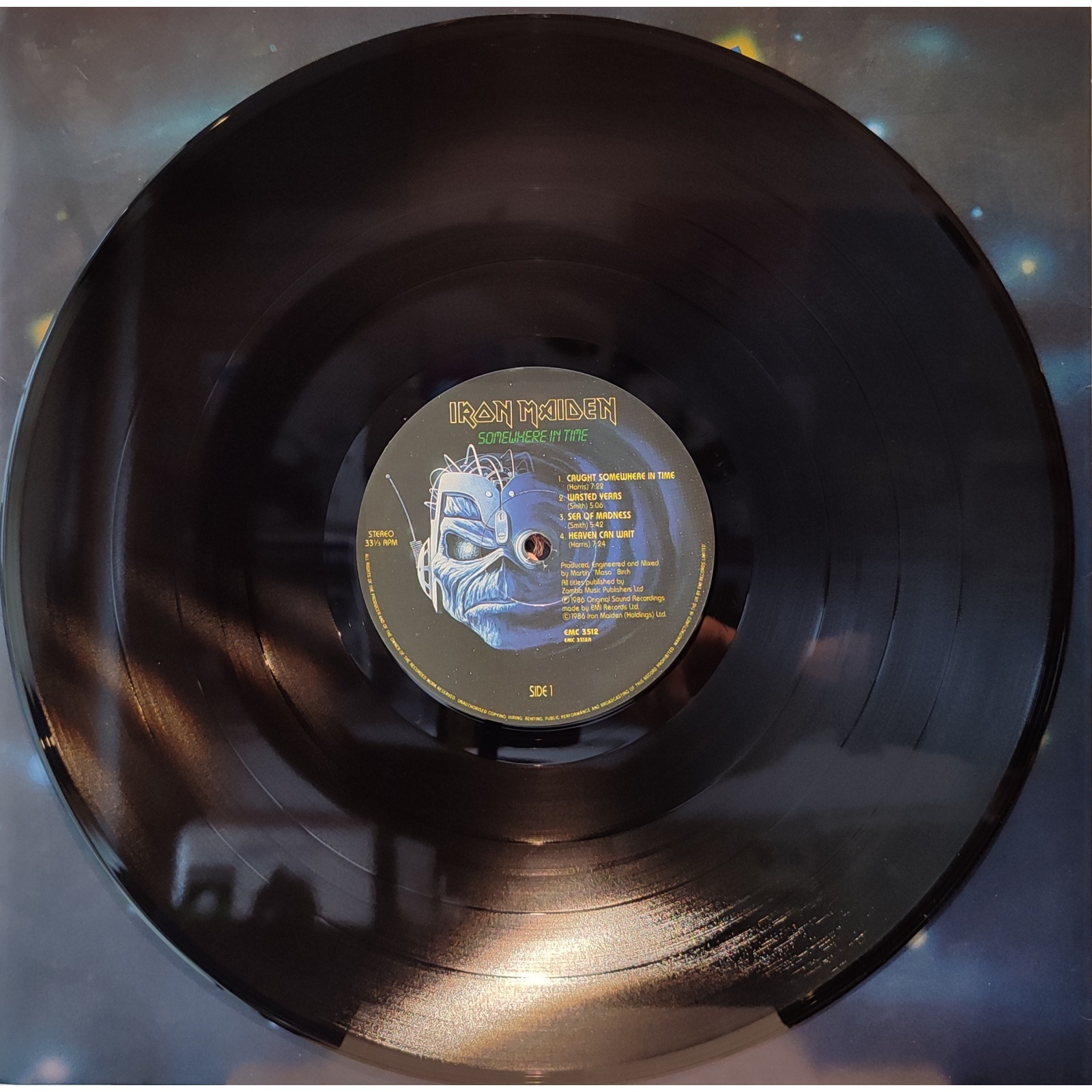 Prima edizione inglese, in vinile di seconda mano, del sesto album in studio del gruppo heavy metal britannico Iron Maiden,"Somewhere in time".