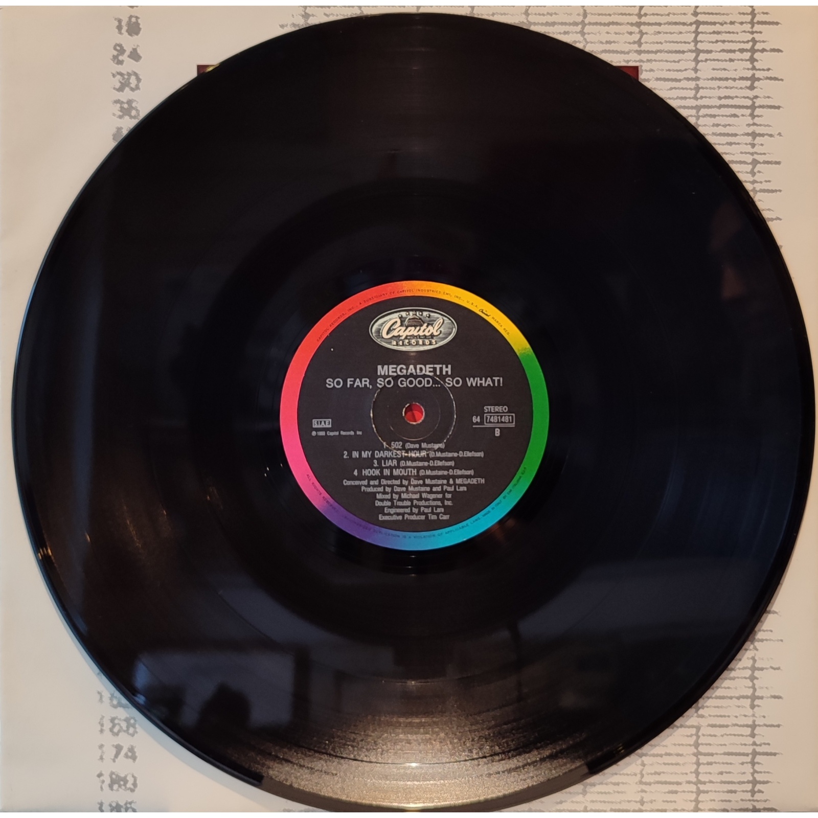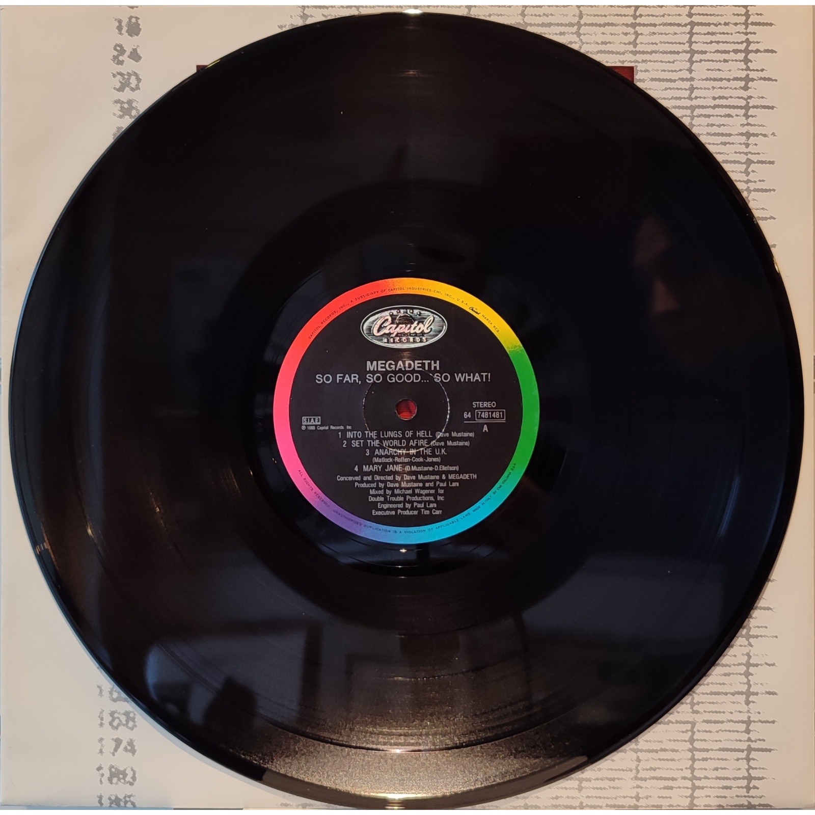 Perfetta prima edizione italiana, in vinile di seconda mano, del terzo album in studio della band heavy metal statunitense Megadeth,"So far, so good...so what!".