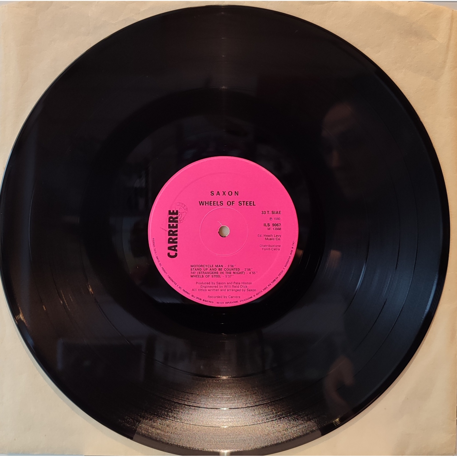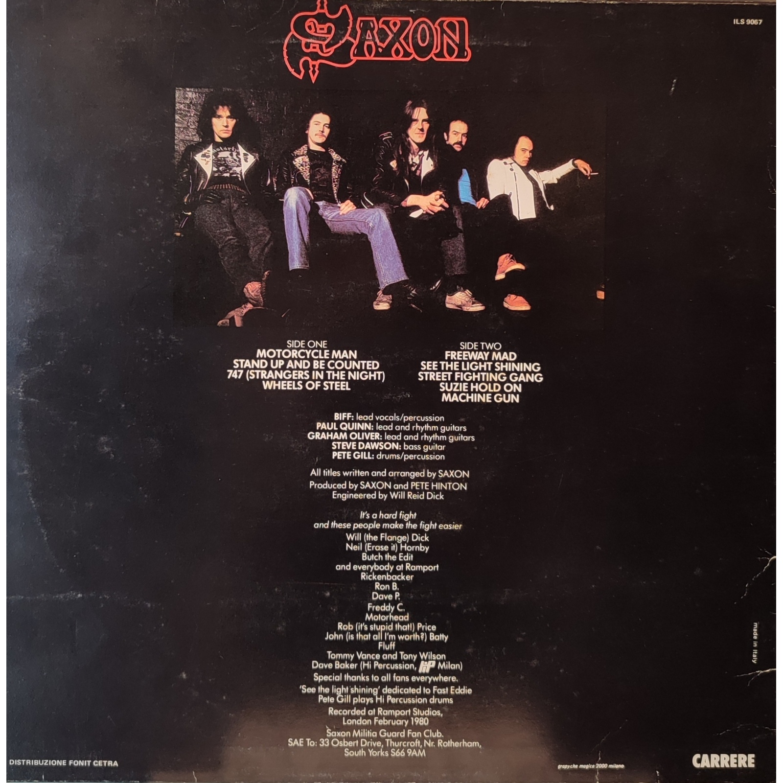 Prima edizione italiana, in vinile di seconda mano, del secondo album in studio del gruppo heavy metal britannico Saxon,"Wheels of steel".