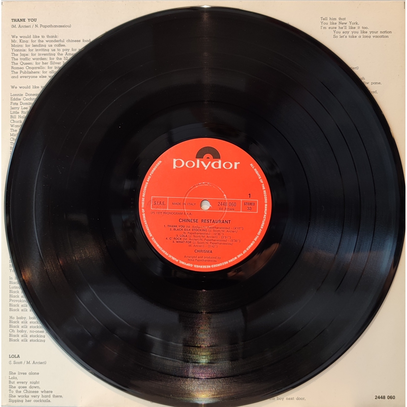 Prima edizione italiana, in vinile di seconda mano, del primo album in studio del duo new wave e post punk italiano Chrisma,"Chinese restaurant".