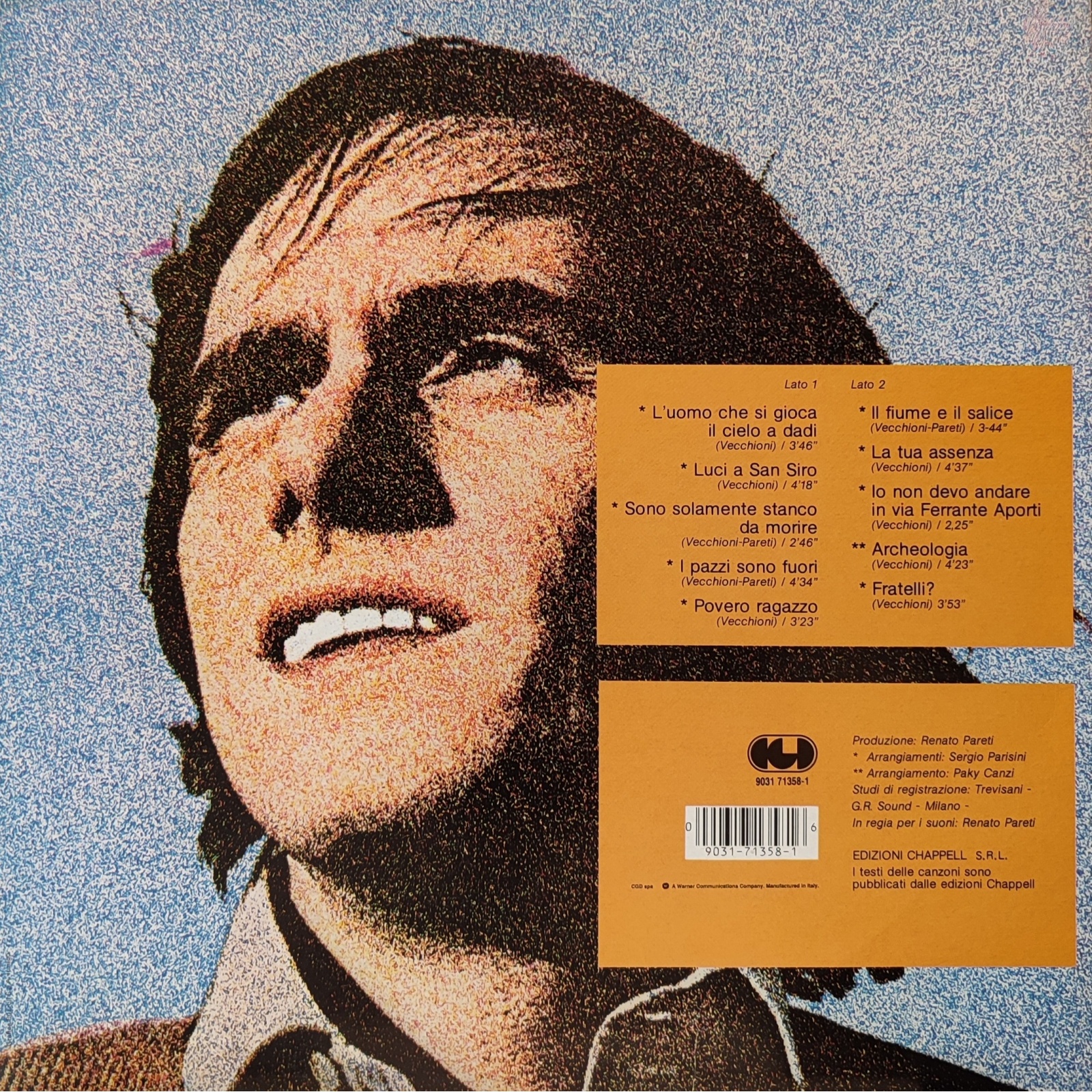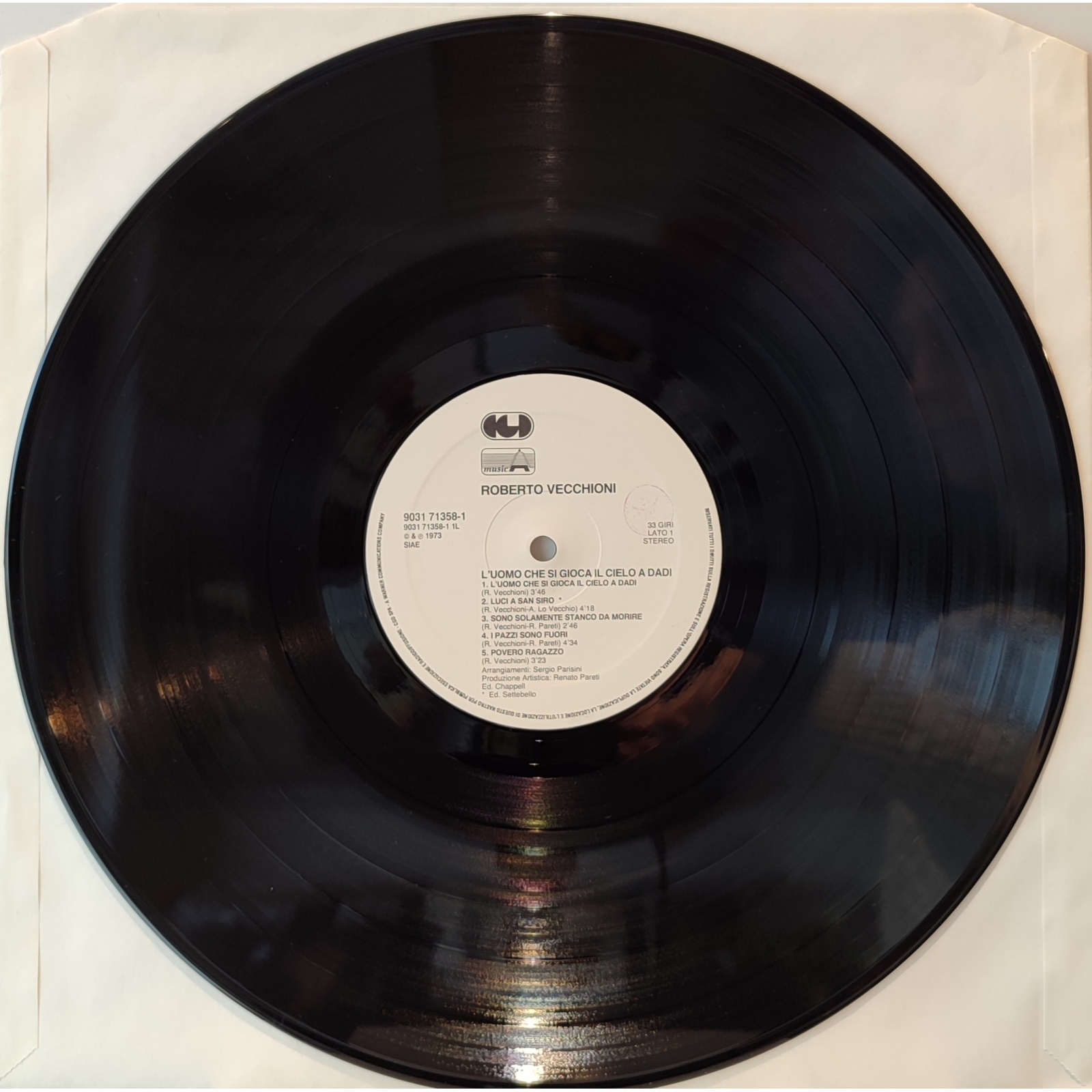 Ristampa italiana, in vinile di seconda mano, del terzo album in studio del cantautore italiano Roberto Vecchioni,"L'uomo che si gioca il cielo a dadi".
