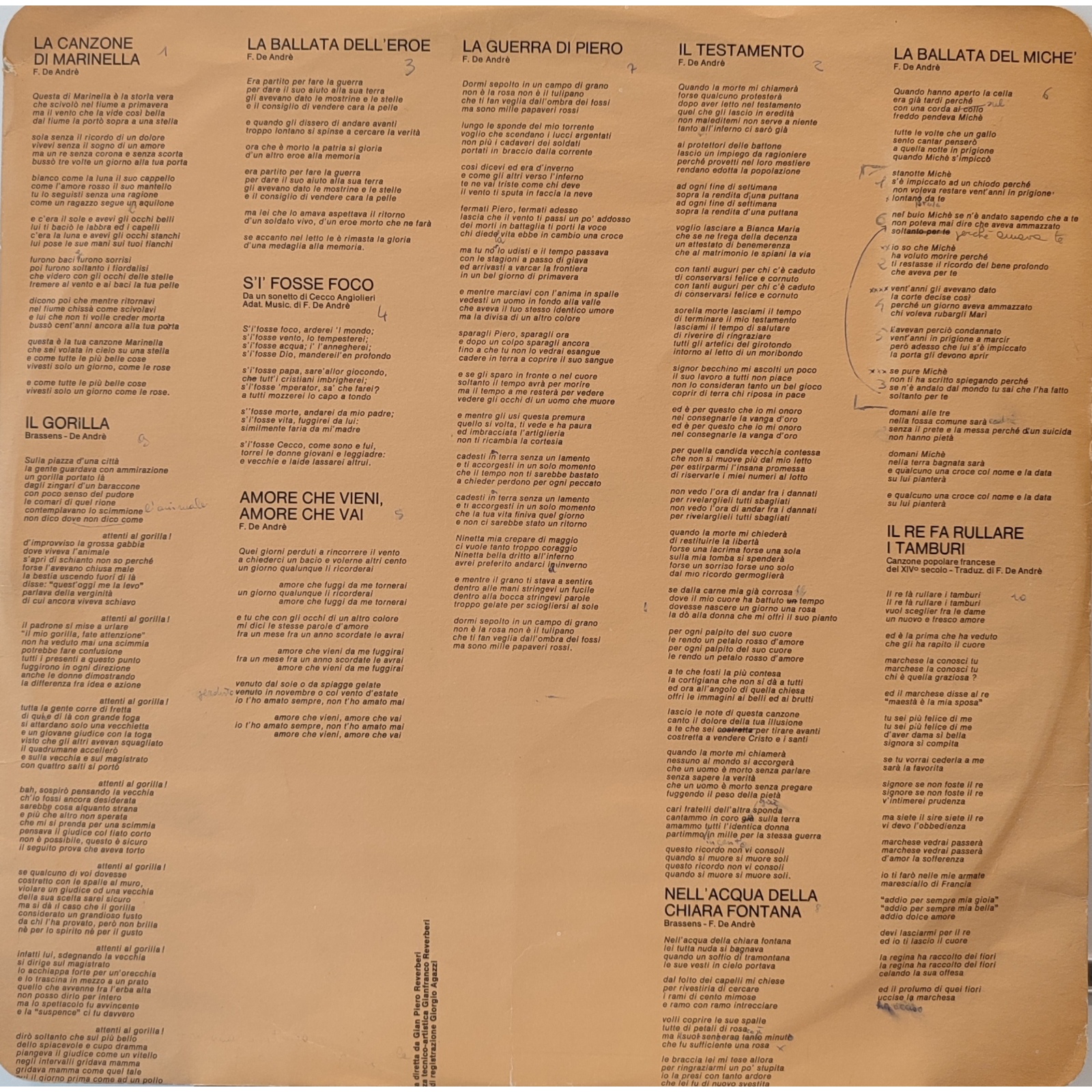 Dopo "Tutti morimmo a stento" De André era entrato in crisi sul da farsi e realizzò un disco con varie reincisioni di canzoni già pubblicate con la Karim, alternate a quattro brani inediti: tra questi, due traduzioni da Georges Brassens, "Il gorilla" e "Nell'acqua della chiara fontana", un sonetto di Cecco Angiolieri messo in musica, "S'i' fosse foco", ed un brano presentato come "tradizionale francese del XIV secolo", "Il re fa rullare i tamburi", che anni prima era stata incisa nella lingua d'origine da Yves Montand.