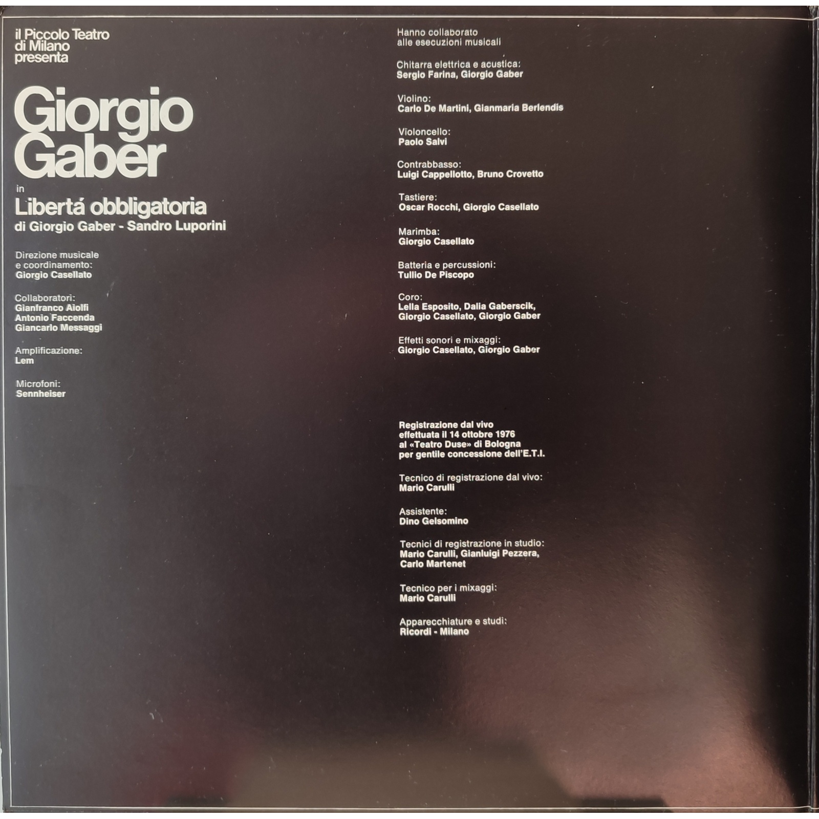 Il disco è stato registrato dal vivo al Teatro Duse di Bologna il 14 ottobre 1976.