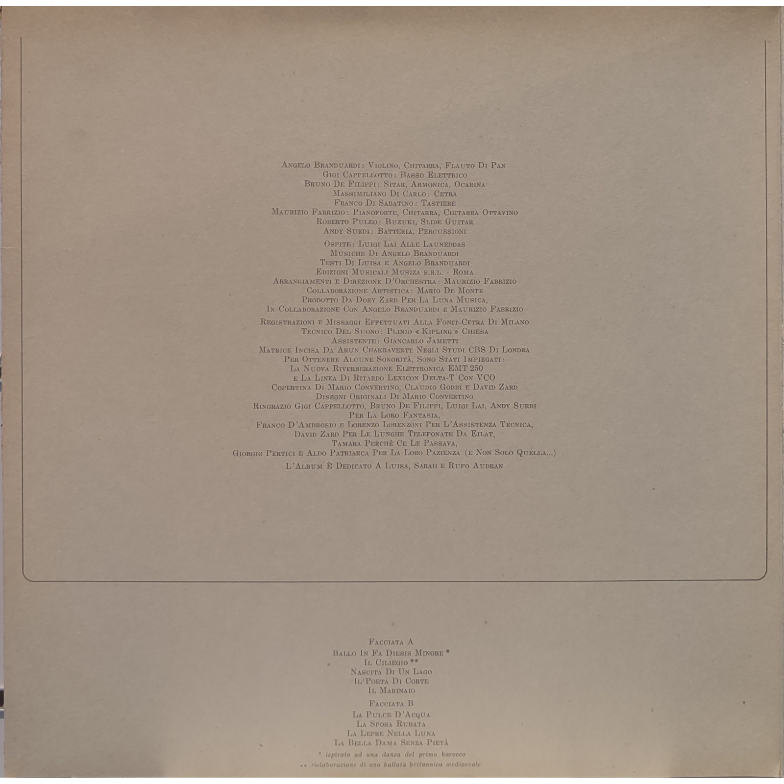 La prima edizione è accompagnata da nove tavole disegnate da Mario Convertino, in cui l'artista interpretava, con i suoi disegni, le canzoni del disco; la tavola de "La pulce d'acqua", è diventata la copertina della prima stampa in CD dell'LP.