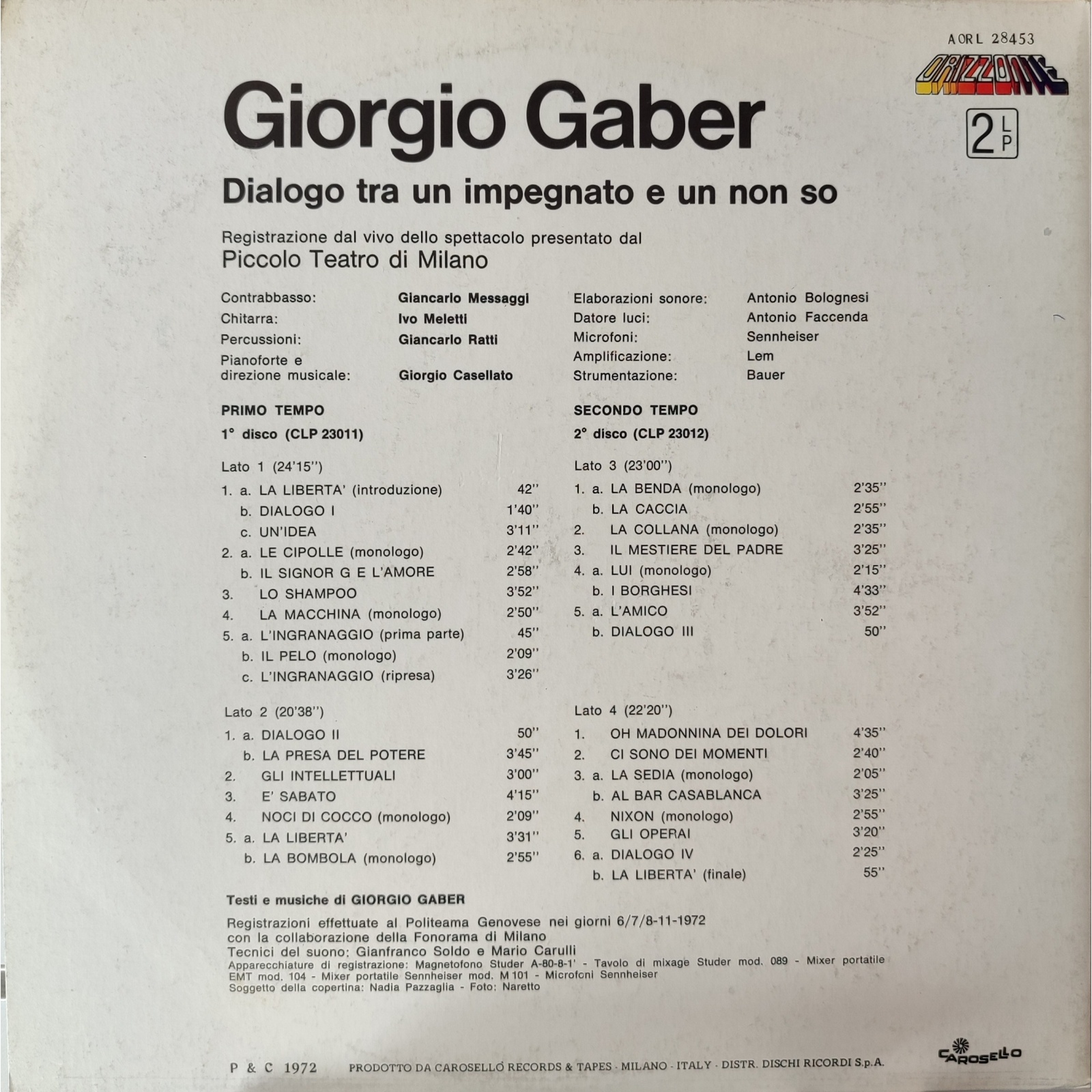 I tecnici del suono sono Gianfranco Soldo e Mario Carulli; il soggetto della copertina è di Nadia Pazzaglia, mentre le note di copertina sono di Franco Lorenzo Arruga, (dalla Presentazione all'interno del programma dello spettacolo).