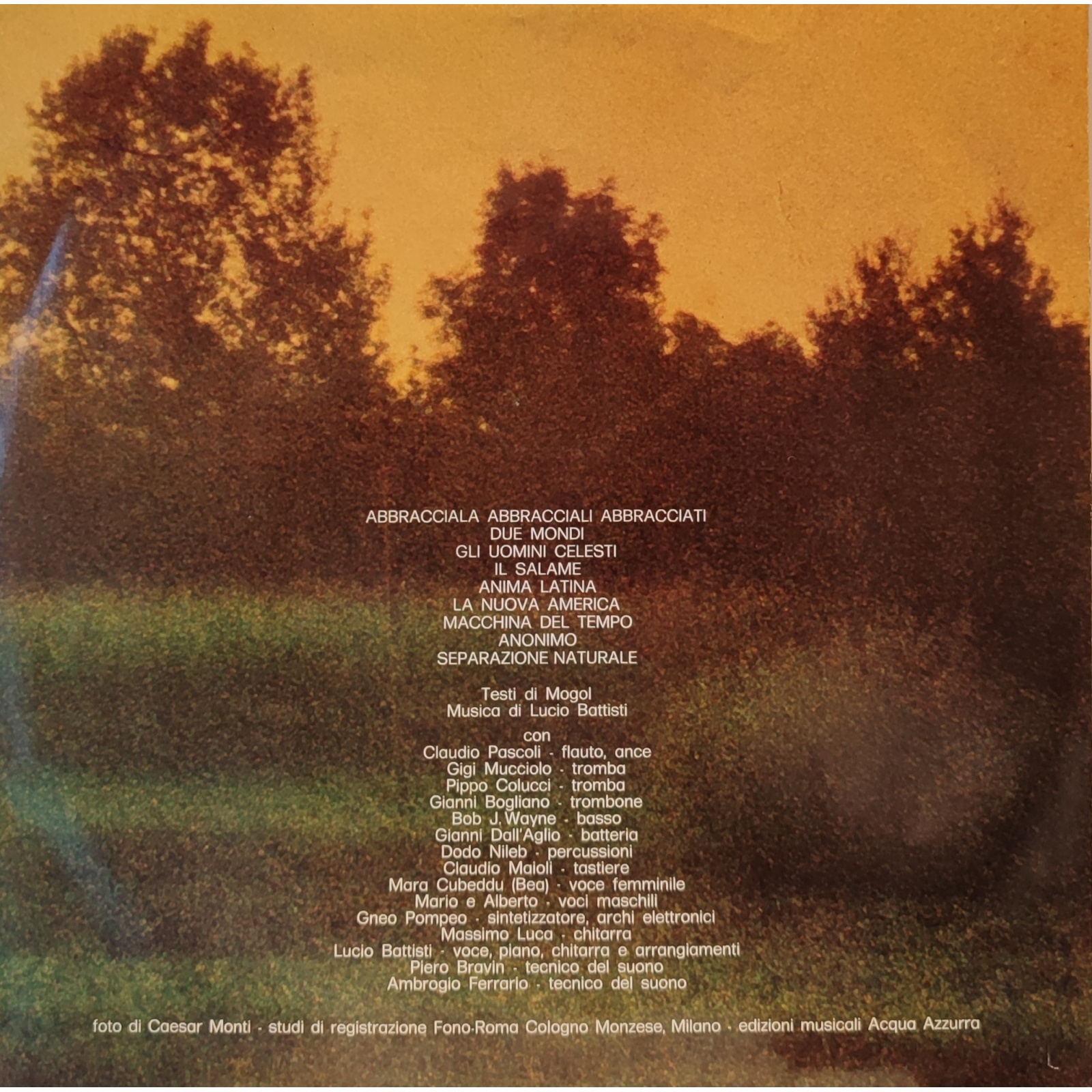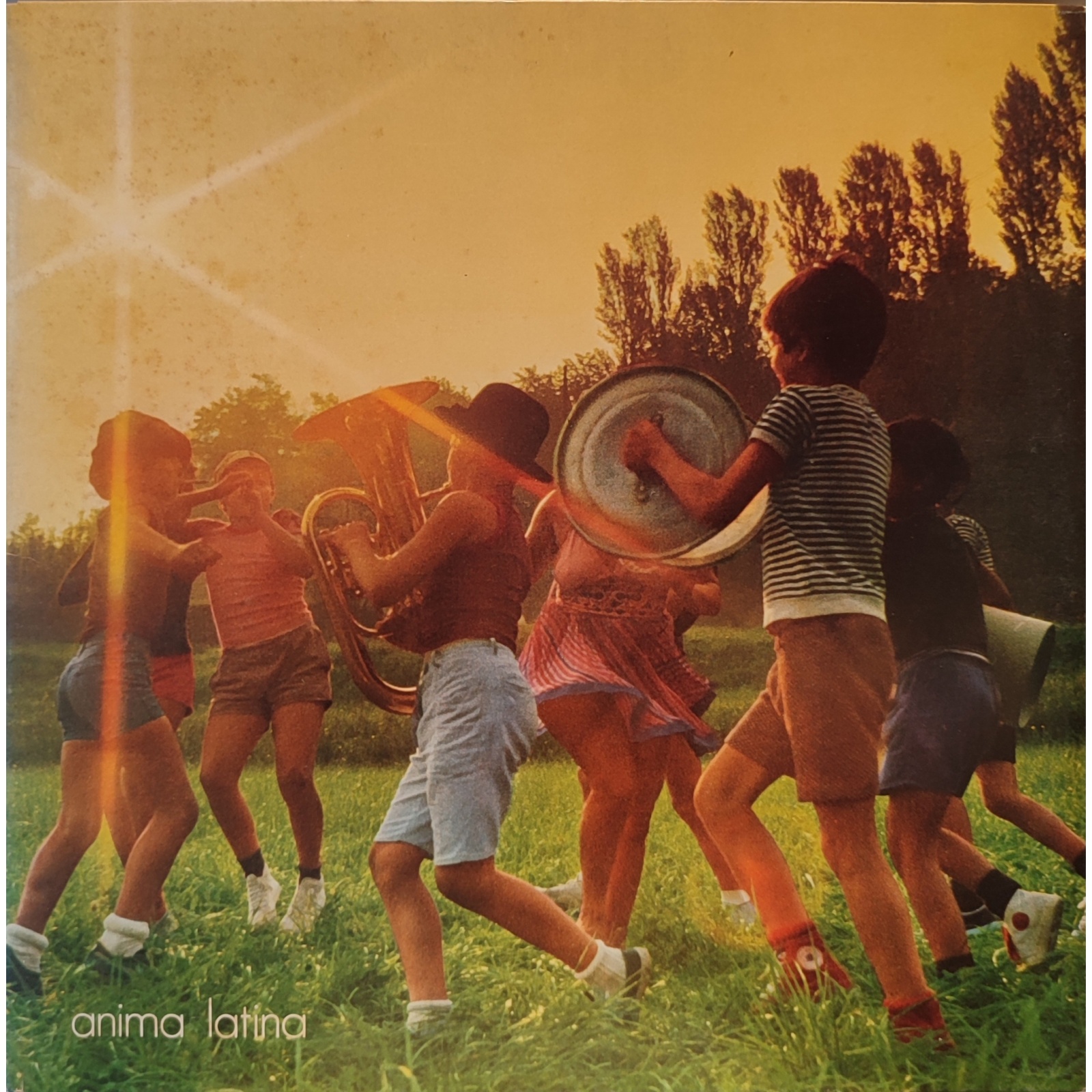 «Il titolo del disco ispirò l'immagine, così decisi di rappresentare l'anima latina con la figura di una donna florida, ma dallo sguardo triste. Dina, una signora dalla simpatia esplosiva, l'avevo già fotografata per la copertina dei Flora Fauna Cemento. Attorno le radunammo, sul prato del Mulino, una schiera di bimbi, tutti figli dei nostri amici. Con l'ausilio di pentole, coperchi, trombe e trombette si organizzò un baccanale, facendo divertire tutti i presenti.»