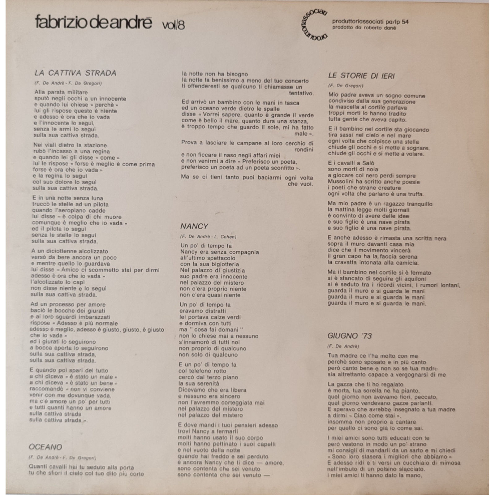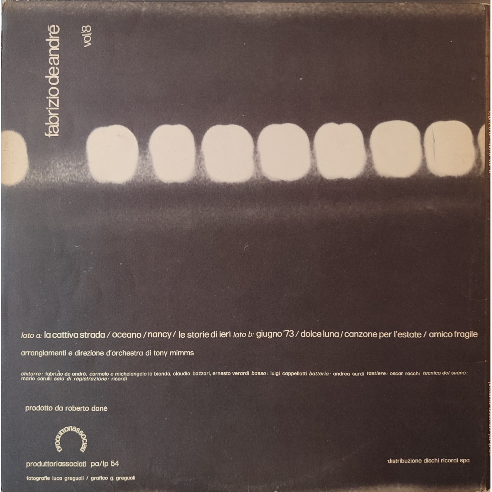 Prima edizione italiana, in vinile di seconda mano, dell'ottavo album in studio del cantautore italiano Fabrizio De Andrè,"Vol.8".