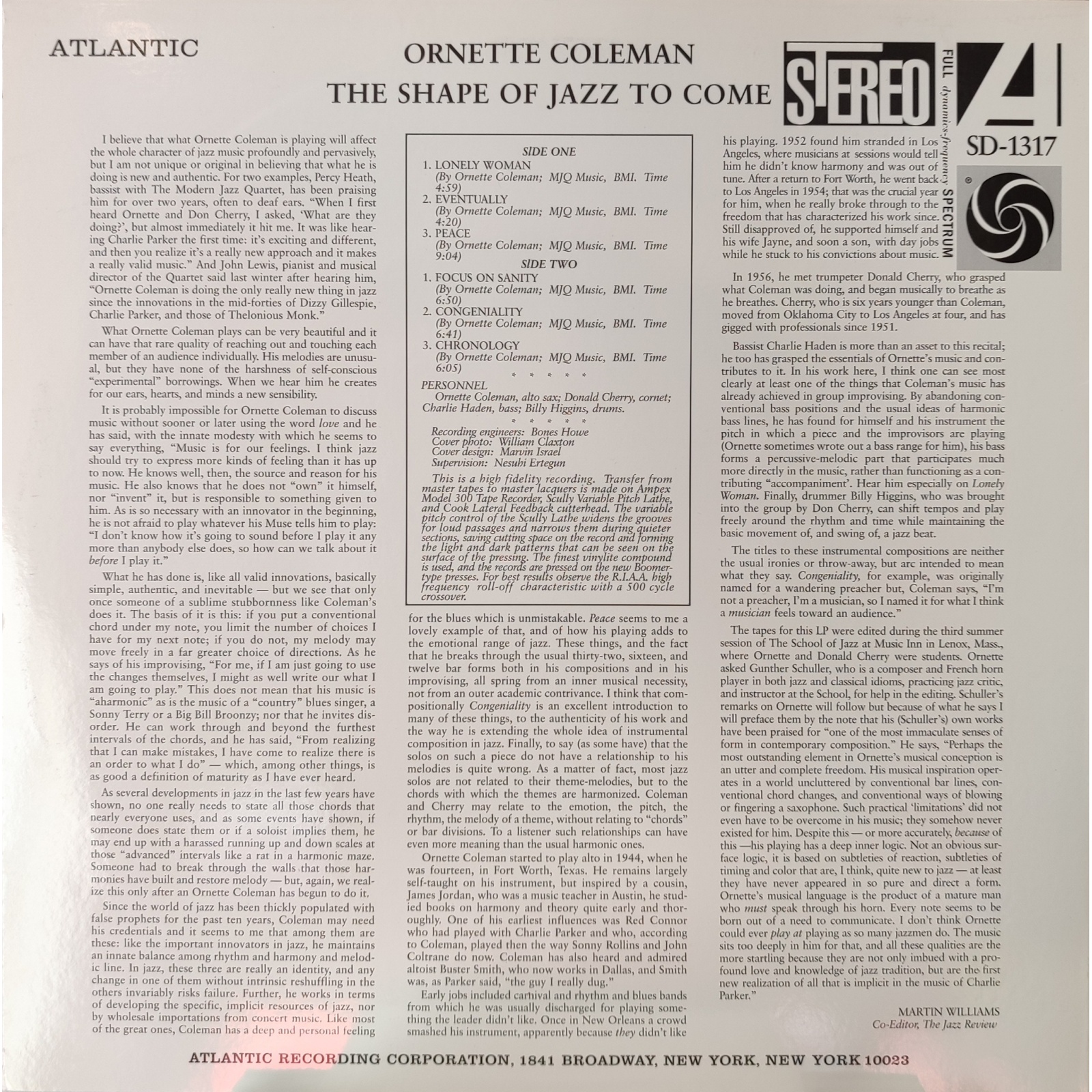 Il metodo compositivo di Coleman non si basava sulla tradizionale teoria armonica ma si sviluppa invece per linee melodiche destrutturate e spesso indipendenti tra loro. Ogni selezione contiene brevi accenni di melodia, in linea con più canonici brani jazz, seguiti da svariati minuti di pura improvvisazione senza schemi, a cui fa seguito la ripetizione del tema principale; mantenendo la struttura del bebop, ma abbandonando l'uso degli accordi.