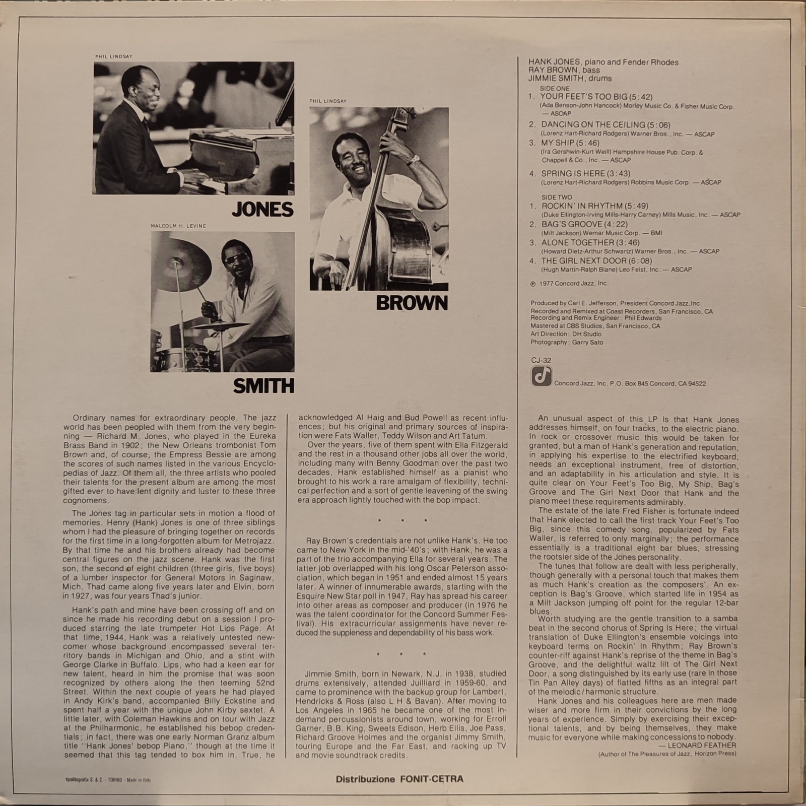 Prima edizione italiana, in vinile di seconda mano, dell'album "Jones Brown Smith"del pianista Hank Jones , del bassista Ray Brown e del batterista Jimmie Smith.