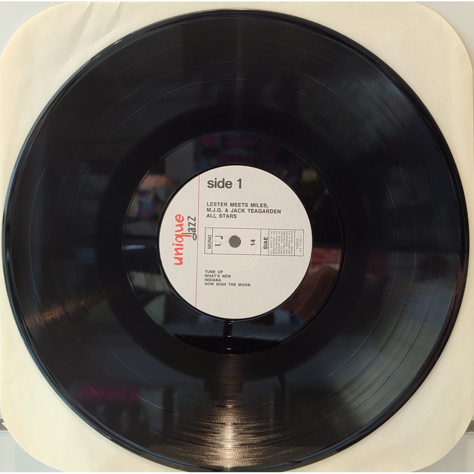 Prima edizione italiana, in vinile di seconda mano, della registrazione non ufficiale "Lester meets Miles,M.J.Q & Jack Teagarden all stars" del sassofonista jazz statunitense Lester Young.