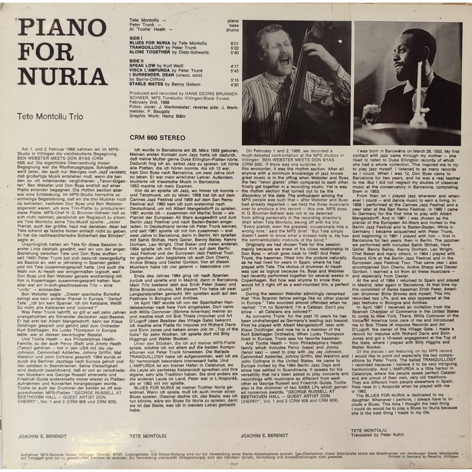 Ristampa tedesca, in vinile di seconda mano, dell'album "Piano for Nuria" del pianista jazz spagnolo Tete Montoliu.
