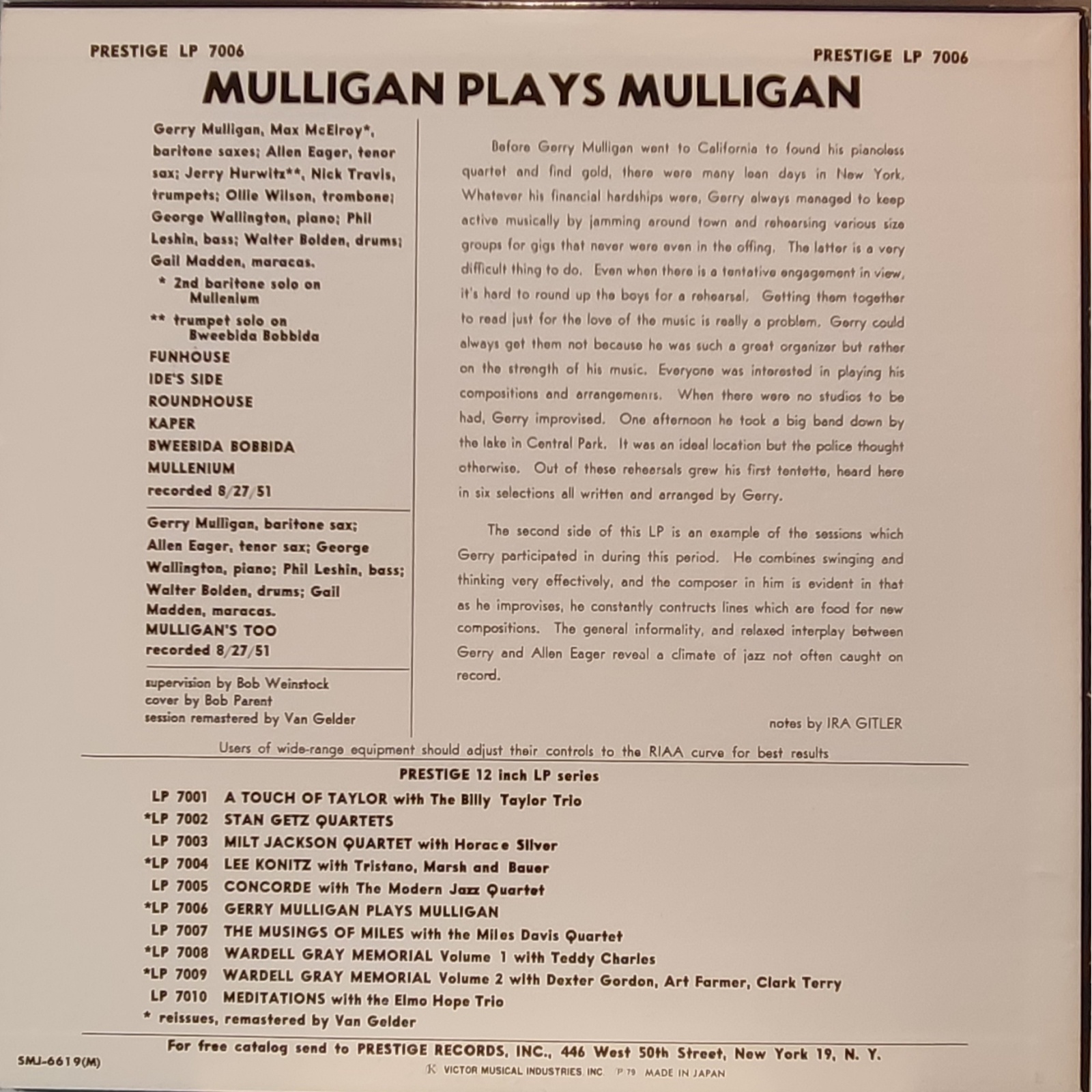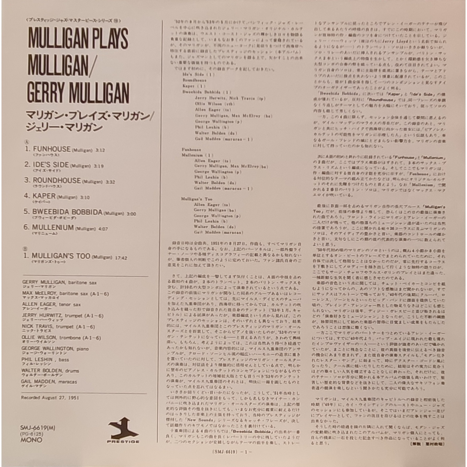 L'album è stato originariamente ripubblicato su LP da 12 pollici come "Mulligan Plays Mulligan" su Prestige 7006 dopo essere stato originariamente pubblicato come LP da 10 pollici nel 1951.