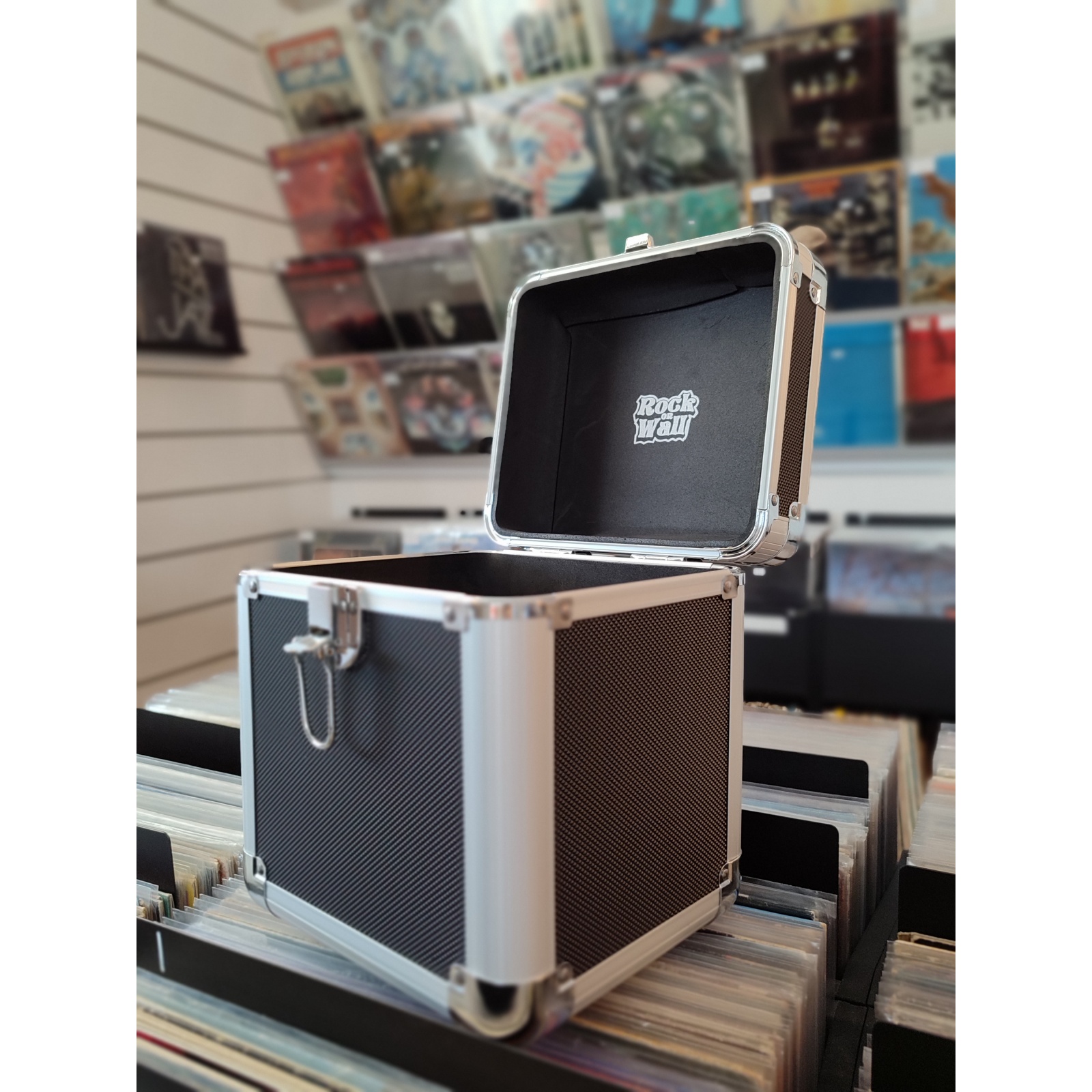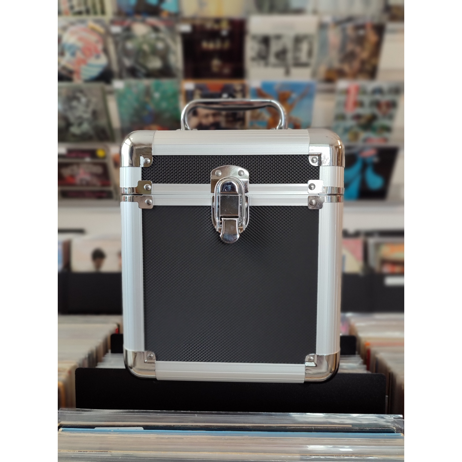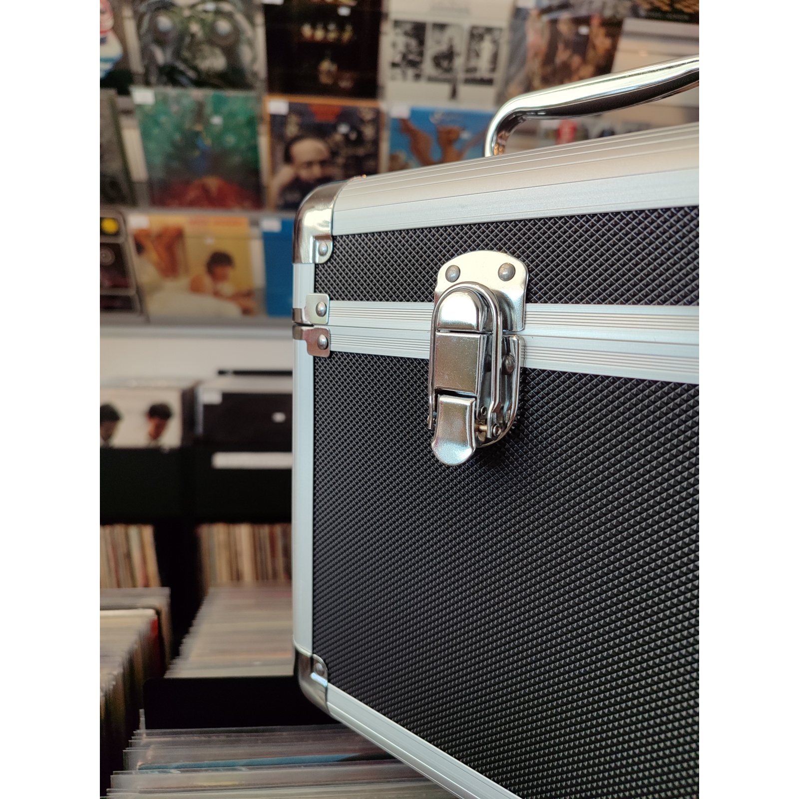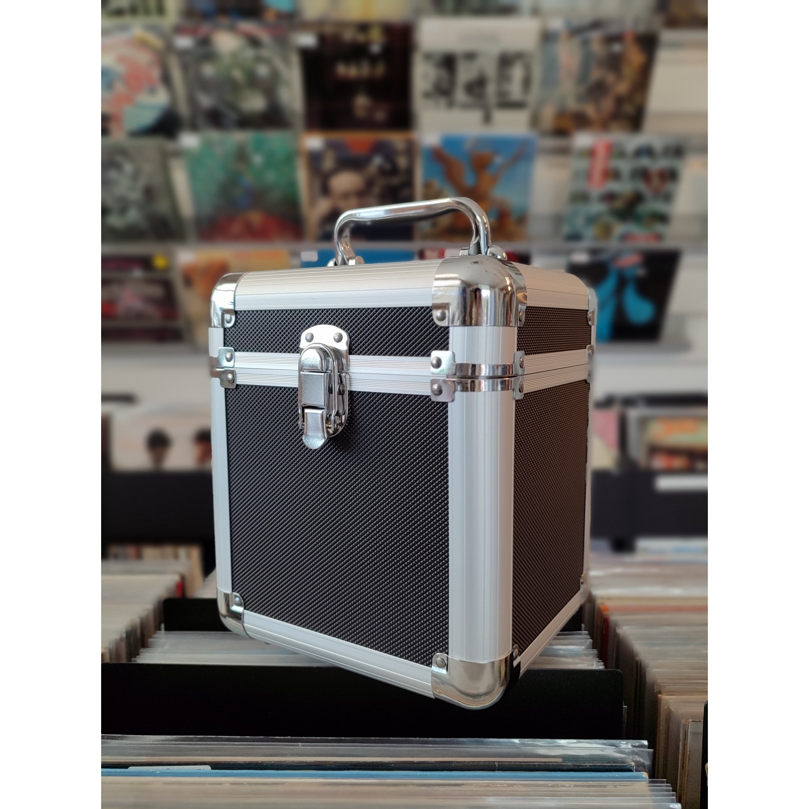 Valigetta porta 45 giri in alluminio, leggera e resistente, dal design elegante e vintage.